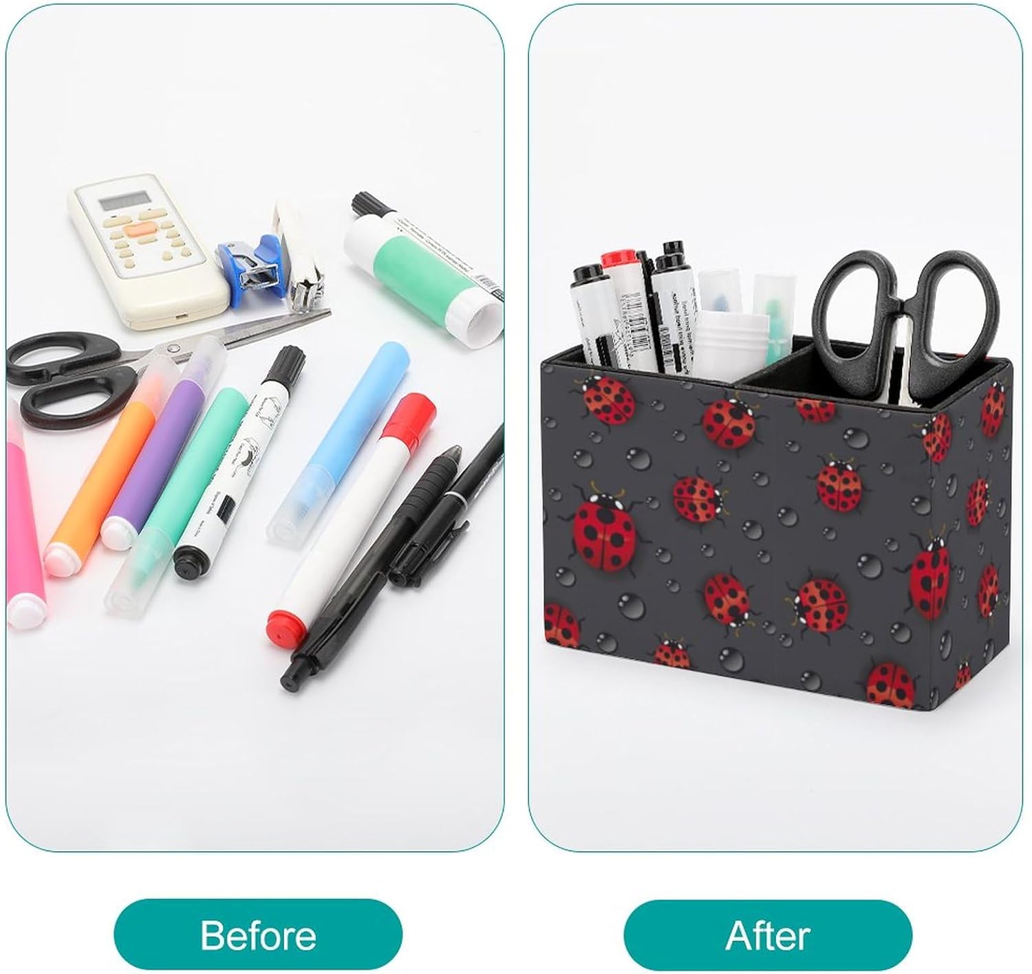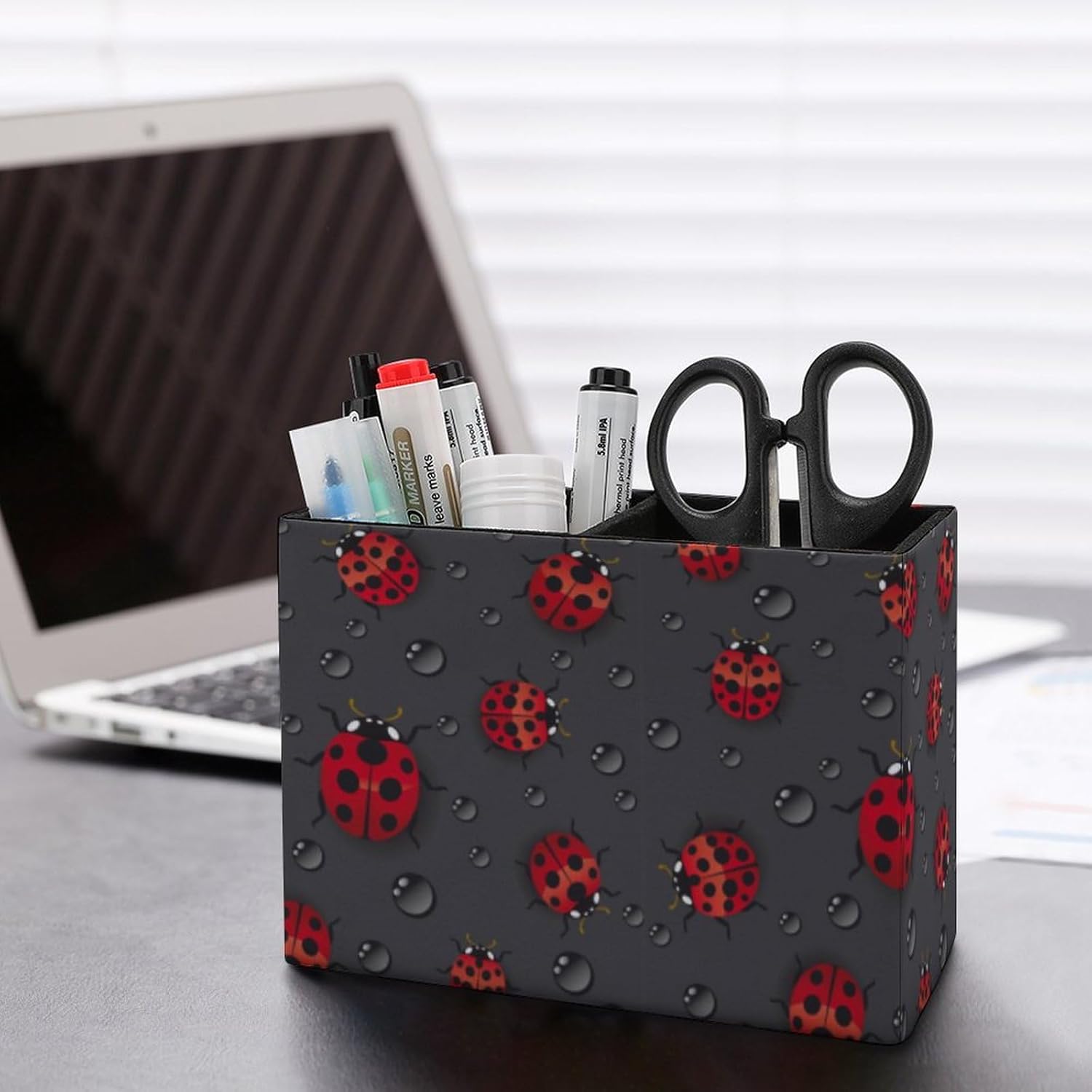 Pen Holder, Pencil Holder for Desk Organizer, Red Ladybugs Waterdrop PU Leather Pencil Cups Desktop Stationery Storage Makeup Brush Holder Pen Organizer for Office Home