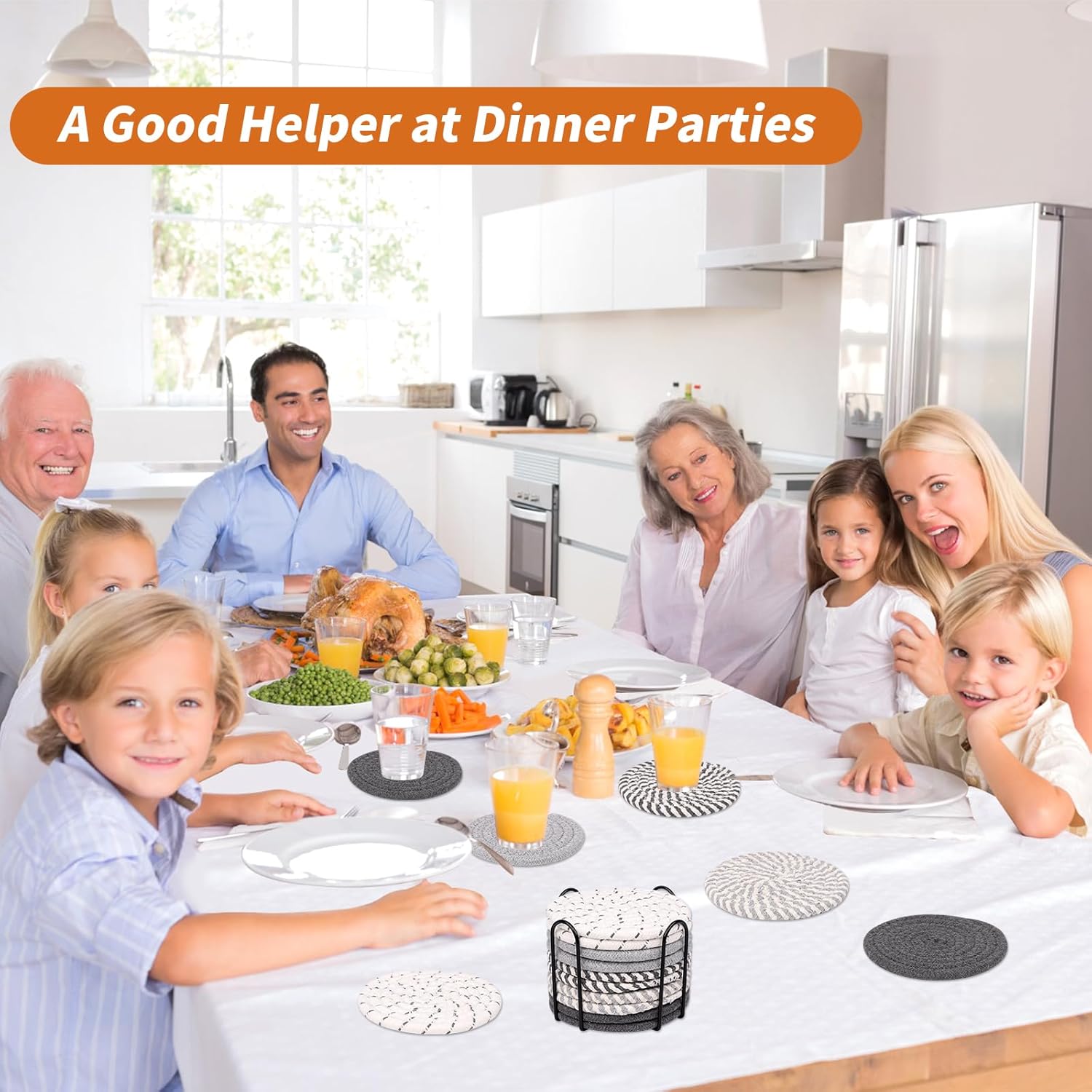 - What You Get: You will get more quantity and more multiple styles coasters from us than any others . You'll get 10pcs round hand-woven cotton coasters (ultra-minimalist style, 4.3") and a 4.3"x3.1" black metal coaster holder.5 colors designs 10pcs in total, which can be used in almost any family scene.
