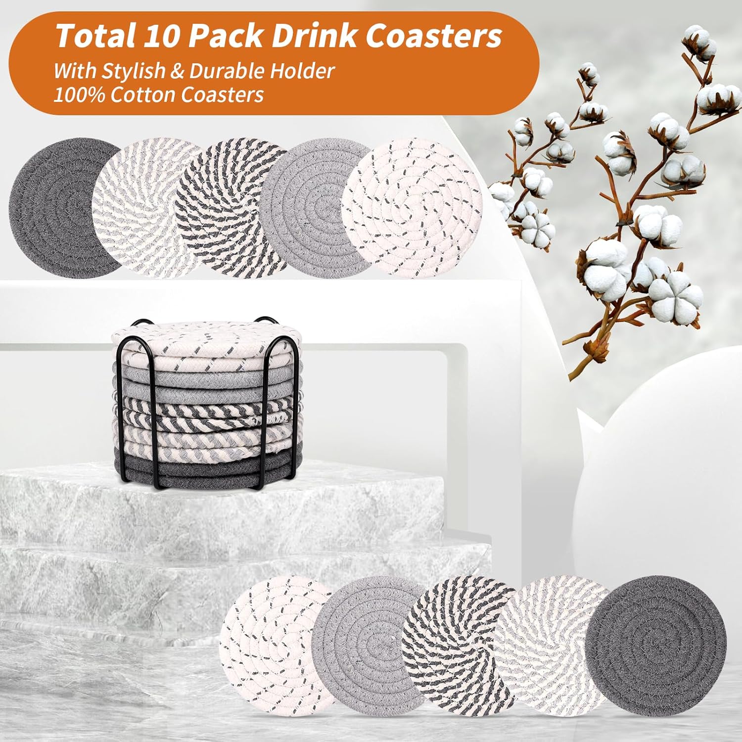 Mckanti 10 Pcs Round Cotton Coasters with Holder, 5 Colors Absorbent Drink Coasters for Home Decor, Grey