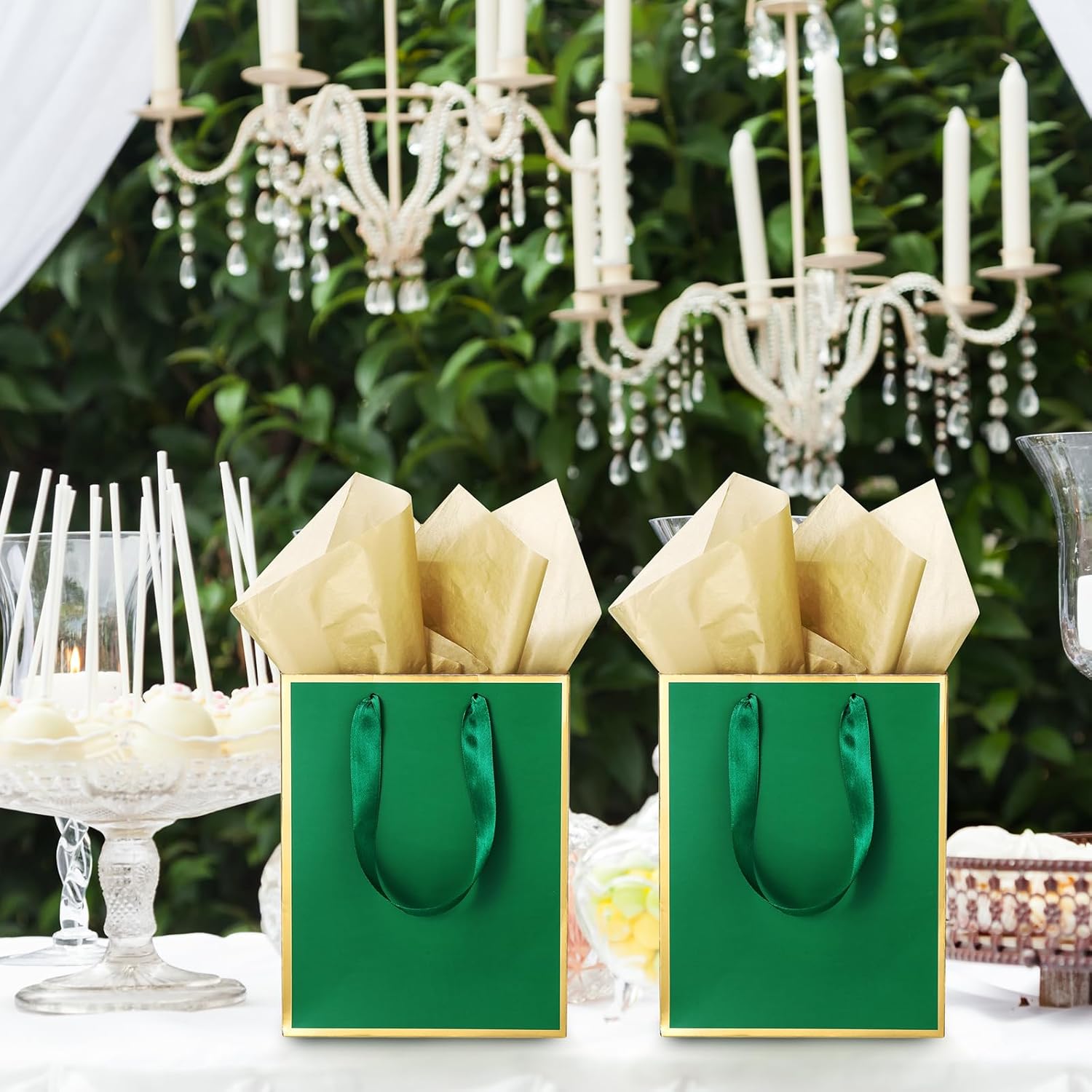 Yeaqee 24 Pack Metallic Paper Gift Bags with Handle and Tissue 9x7x3.1 Gold Foil Welcome Favor Bags Return Gifts for Wedding Fall 5 Senses Christmas Bridesmaid Birthday(Green Gold)