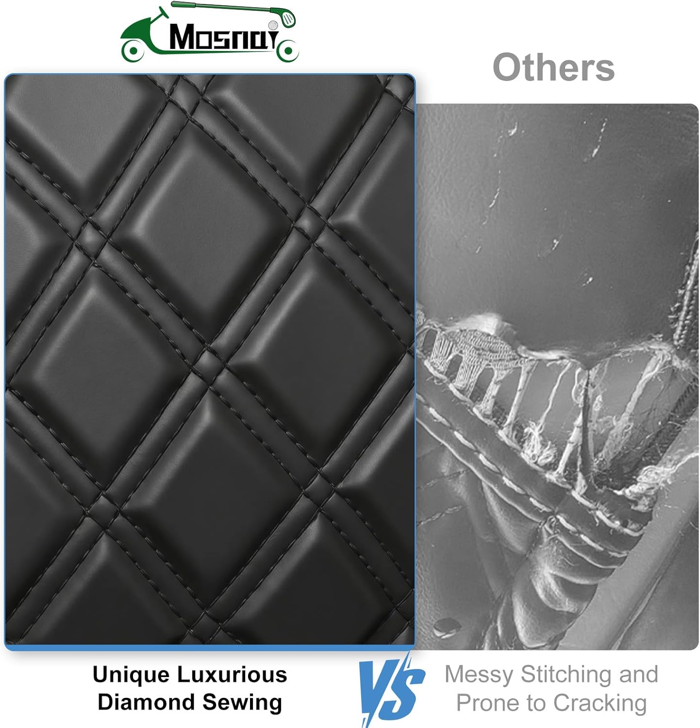 - Upgrade Design: ①Smooth vinyl PVC leather material and black color make it easy to clean and dirty resistance. ②Small pocket for storing keys, cards, Phone etc. ③Square concave and convex design appearance makes your golf cart brand new and fashion.