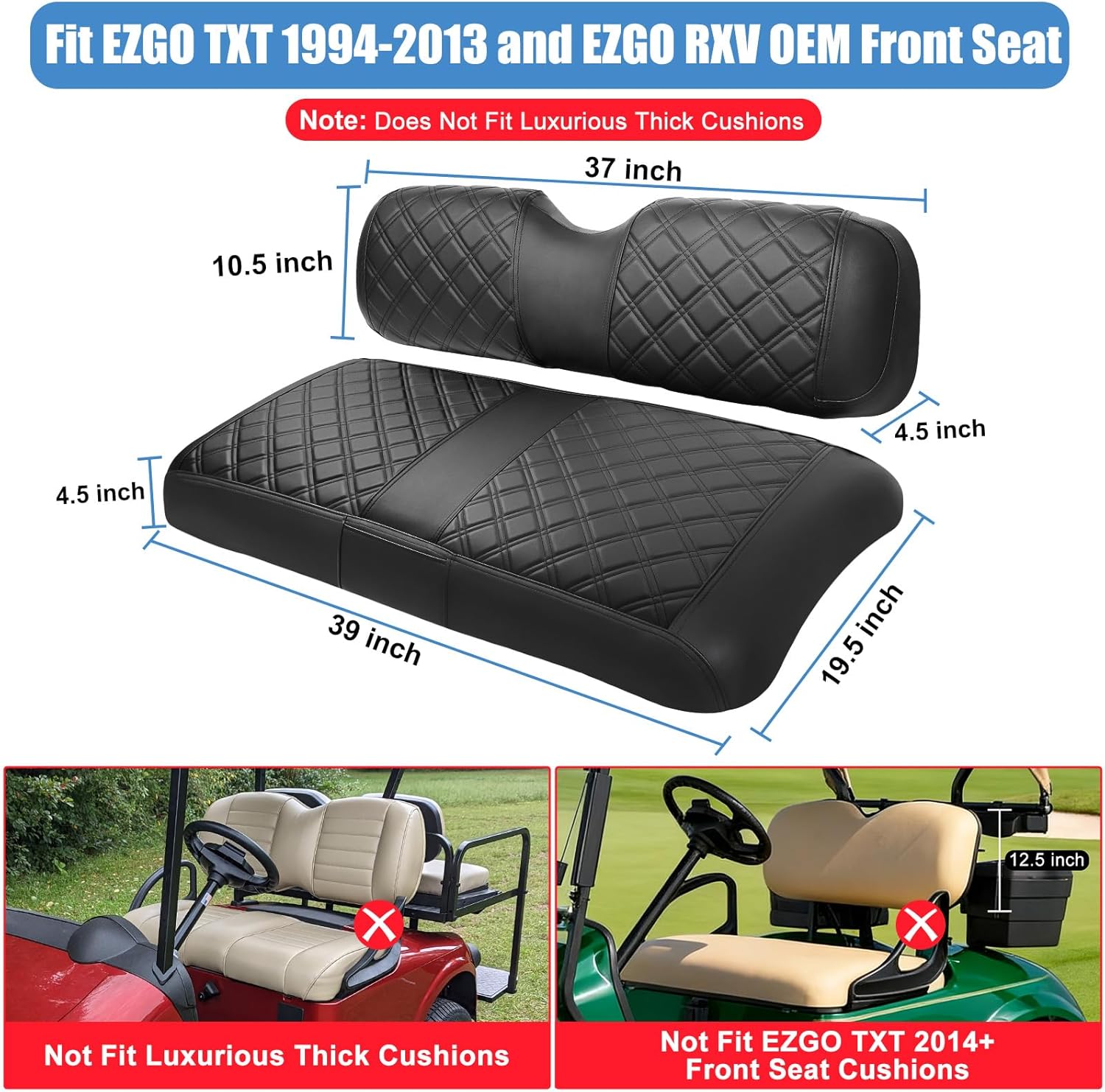 - Fit Models: Golf cart seat covers fit EZGO TXT and EZGO RXV front OEM ordinary seats only.This EZGO seat covers kit contains 1 front backrest cover (about 36.5 X 10.5X 4.5 inches) and 1 front bench seat cover (about 41 X 20.5 X 4.5 inches). Note: NOT fit luxurious thick cushions, NOT fit rear seat.