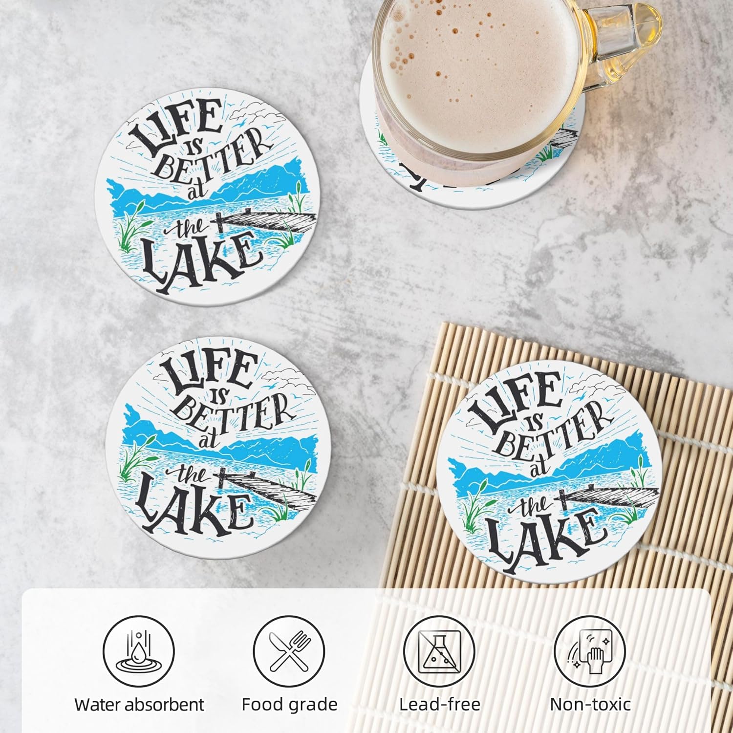 Life is Better Lake Coasters for Drinks Set of 4, Absorbent Ceramic Drink Coasters for Coffee Table Wooden Table Cup Bar, 4 Inches