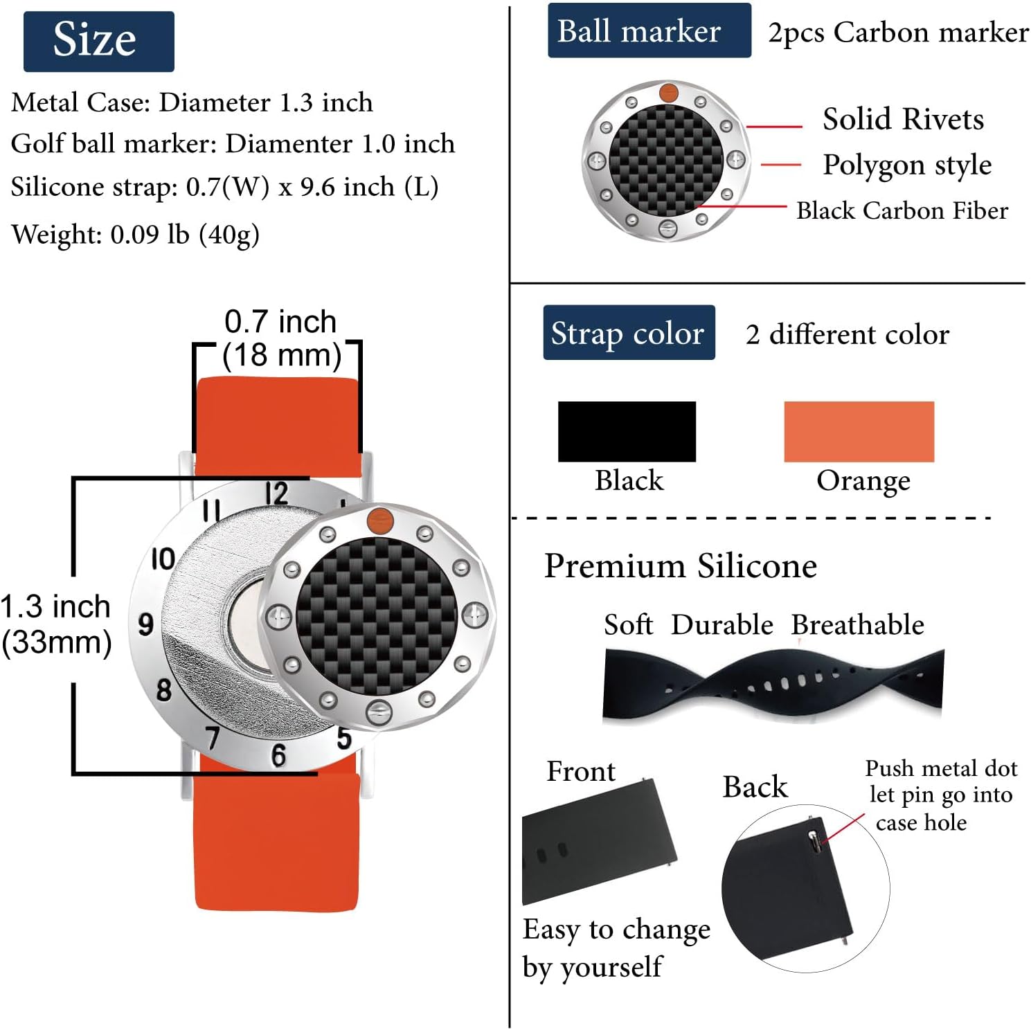 - 🏌️ GOLF GIFTS: Special Carbon Fiber material ball marker, Fashion, unique, elegant, personalized design. Quality zipper box package. Set of golf ball markers and golf shot counter watch. (Size:3.2 inch x 4.5 inch x 1.3 inch) Golf gifts for men women golfer