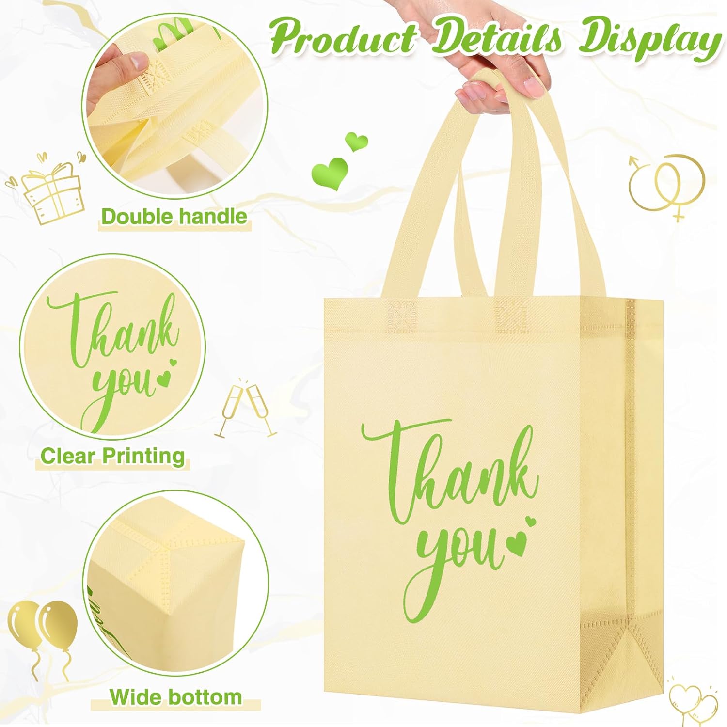 - Applicable for Parties and Daily Life: these thank you tote non woven bags are ideal for weddings and bridal showers, also suitable for birthday parties, baby showers, Thanksgiving, graduation ceremonies, afternoon tea parties, business banquets and other occasions; There is a large enough capacity to hold gifts, jewelry, lipstick, souvenirs, toys, clothes, snacks, candy and more, providing you and your guests with a wonderful party atmosphere