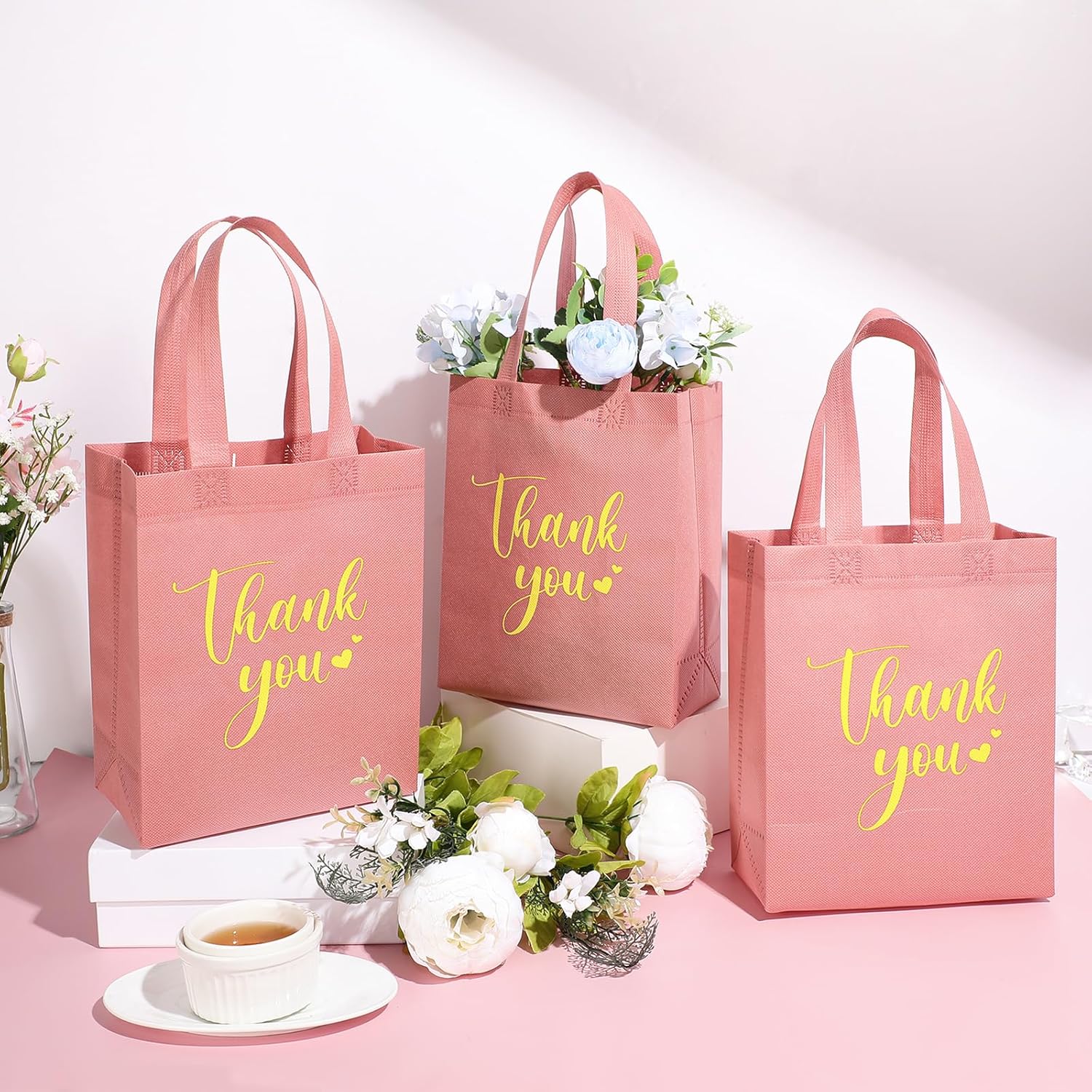 - Applicable for Parties and Daily Life: these thank you tote non woven bags are ideal for weddings and bridal showers, also suitable for birthday parties, baby showers, Thanksgiving, graduation ceremonies, afternoon tea parties, business banquets and other occasions; There is a large enough capacity to hold gifts, jewelry, lipstick, souvenirs, toys, clothes, snacks, candy and more, providing you and your guests with a wonderful party atmosphere