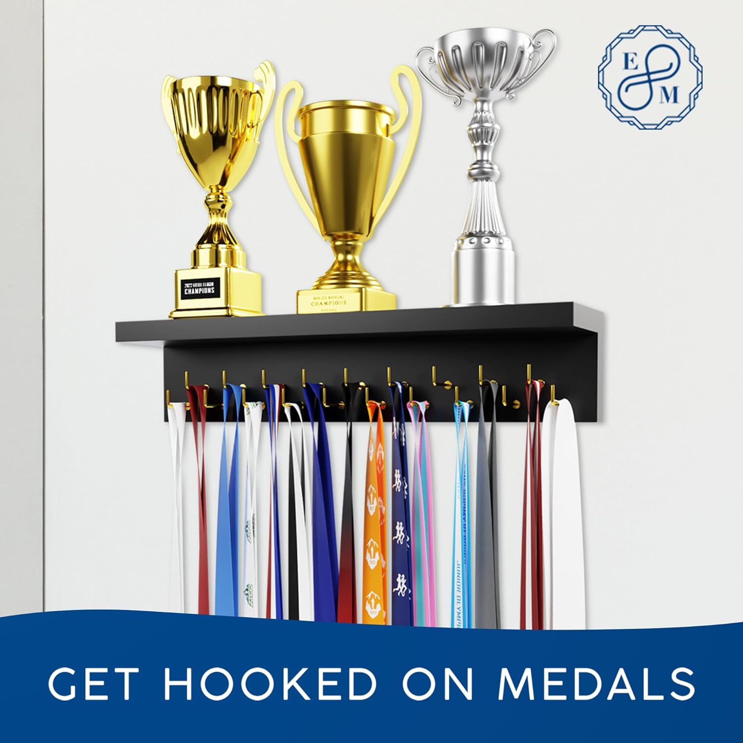 - DISPLAYS TROPHIES in full visual celebration as this medal rack is a trophy and medal display shelf. Hang 19 medals on the 19 extra-long medal hooks and show off hard-won trophies on the trophy shelf