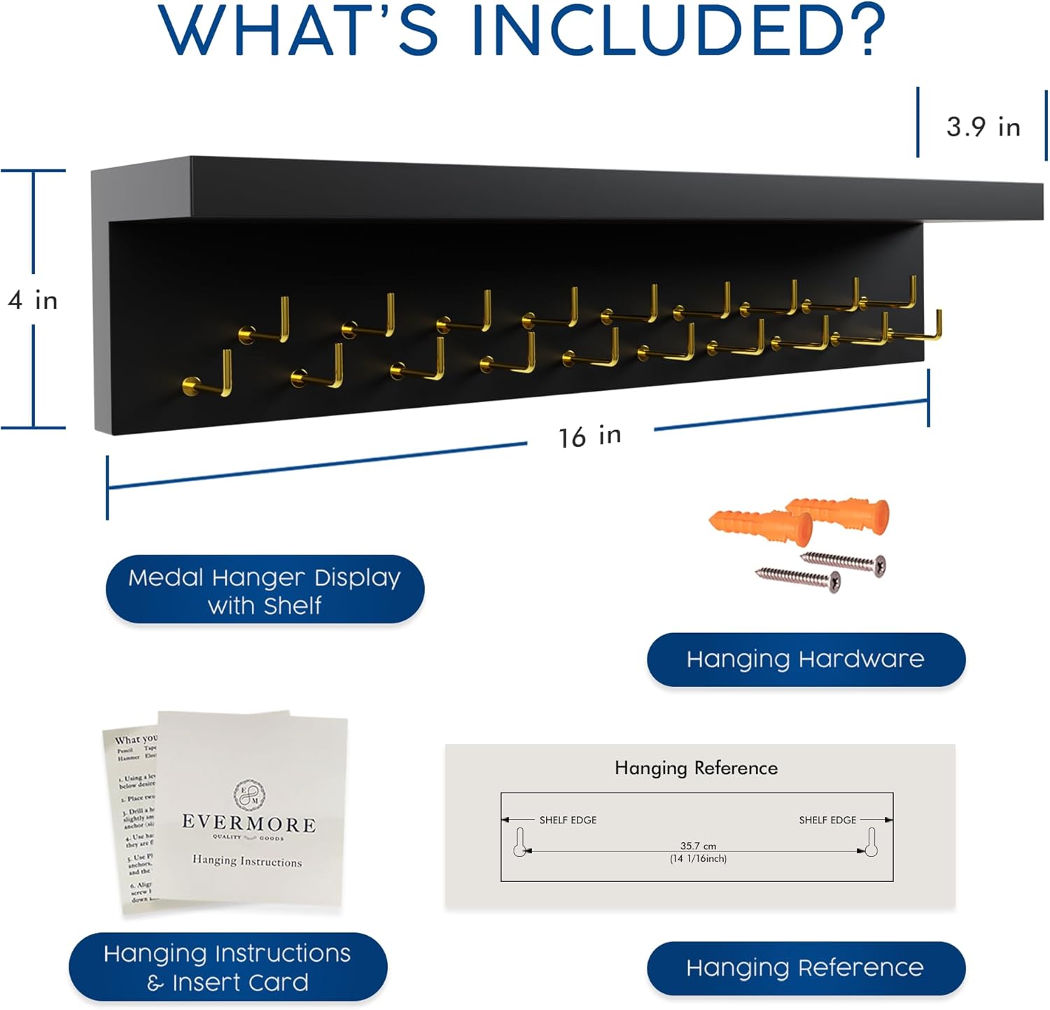 - SAVOR YOUR WINS! Evermore’s sleek, chic wooden medal hanger display with shelf level is a medal awards rack that can inspire you to crush even more achievements.
