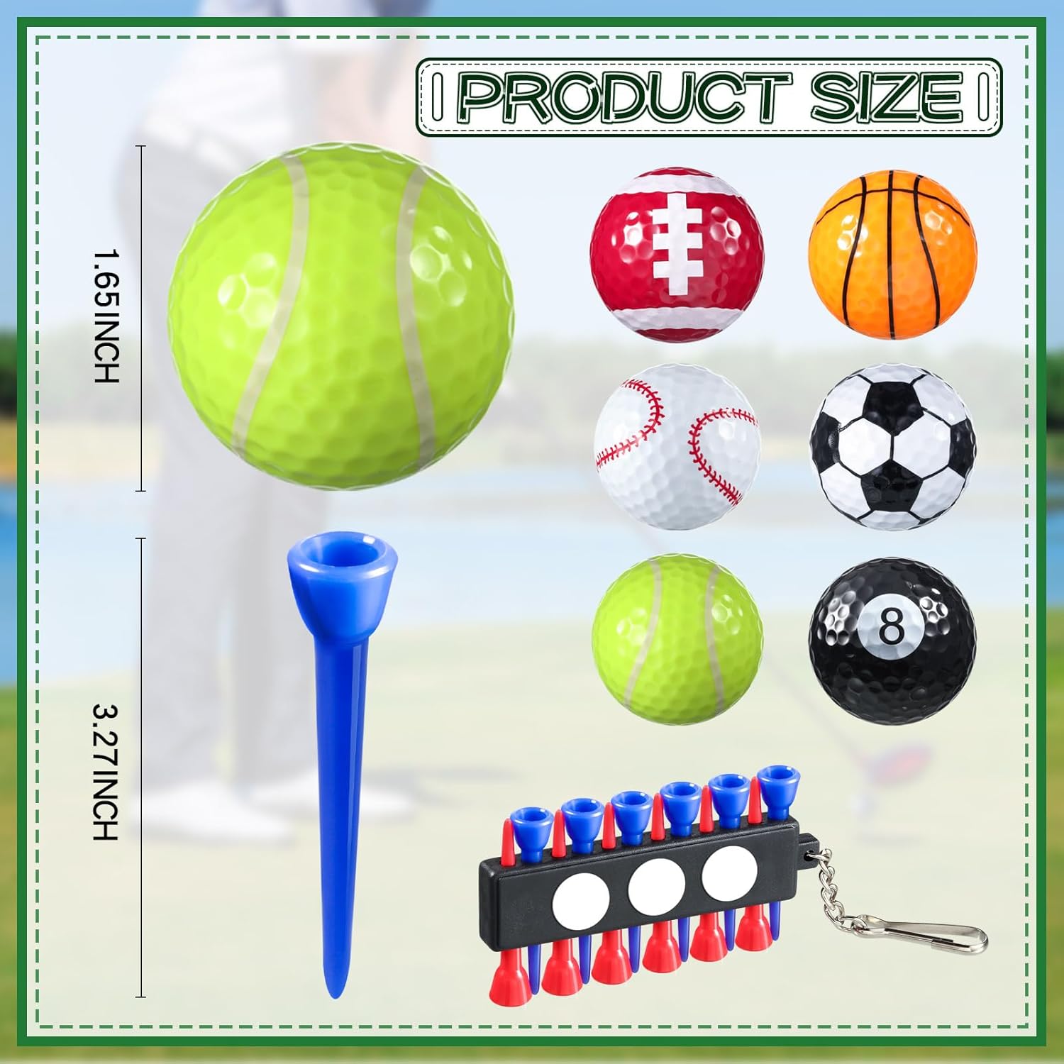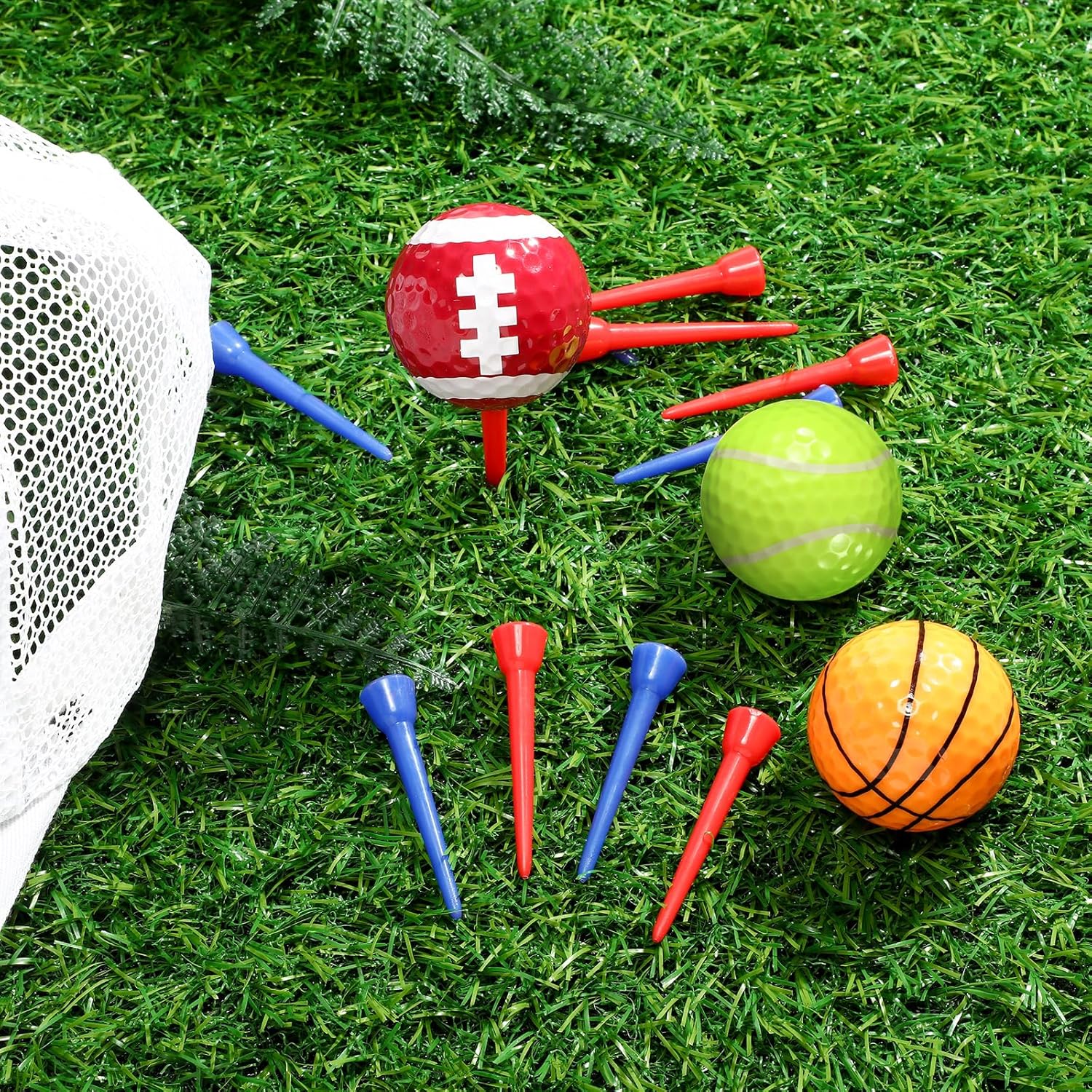- Sports Themed Elements: our colored golf balls contain different sports designs, such as basketball, baseball, football, football, tennis ball and size 8 ball; These balls can add a little fun to your game and training, providing fun and challenging and enjoyable play; You'll find these colorful balls and pegs in no time in the grass