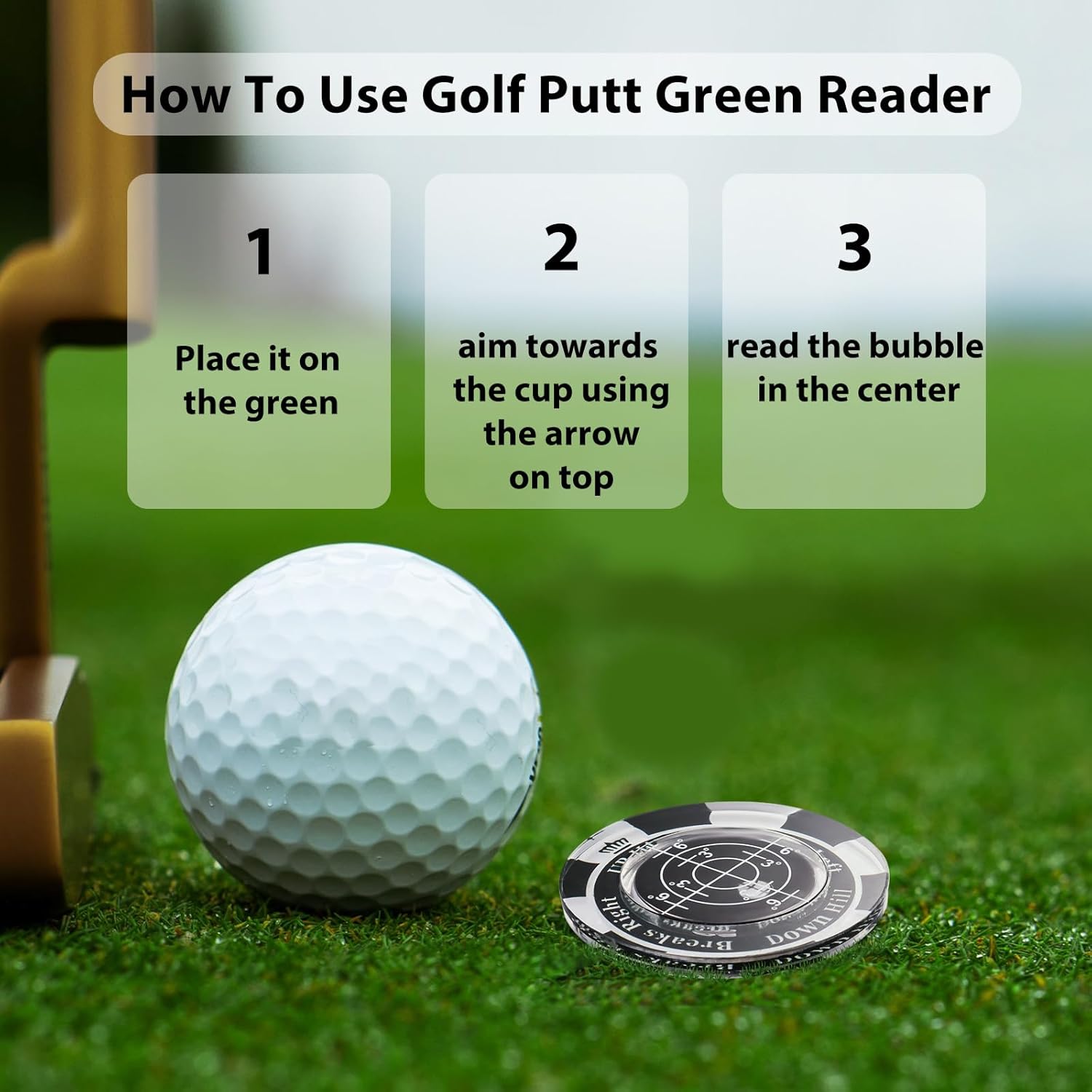 • Green reading process in 3 easy steps: 1.Place it on the green, 2.aim towards the cup using the arrow on top 3. read the bubble in the center. It not only visualizes slopes such as uphill, downhill, and breaks but also provides precise angle measurements. Within a 5 ft putt, measuring behind the ball yields optimal results, while multiple points are recommended for longer putts.