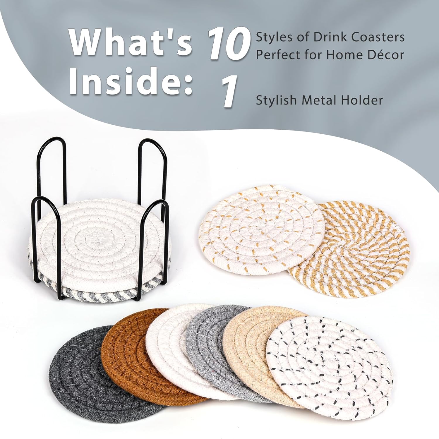 Mckanti 10 Style Drink Coasters with Holder, Absorbent Coasters for Coffee Table, Minimalist Cotton Woven Coaster Set for Home Decor Tabletop Protection Suitable for Kinds of Cups, 4.3 Inches.