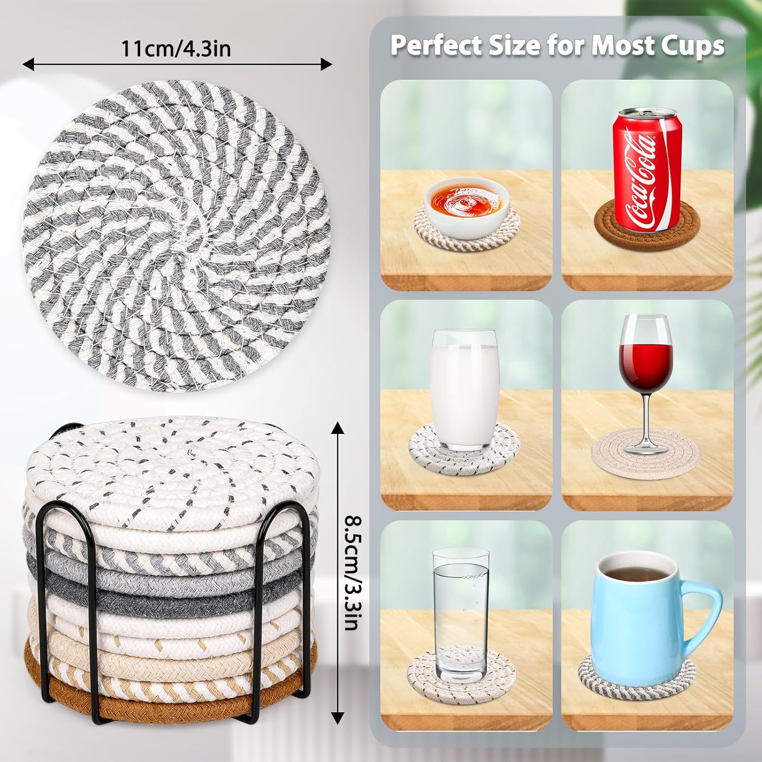 - What You Get: You will get more quantity and more multiple styles coasters from us than any others . You'll get 10pcs round hand-woven cotton coasters (ultra-minimalist style, 4.3") and a 4.3"x3.1" black metal coaster holder.10 colors designs 10pcs in total, which can be used in almost any family scene.