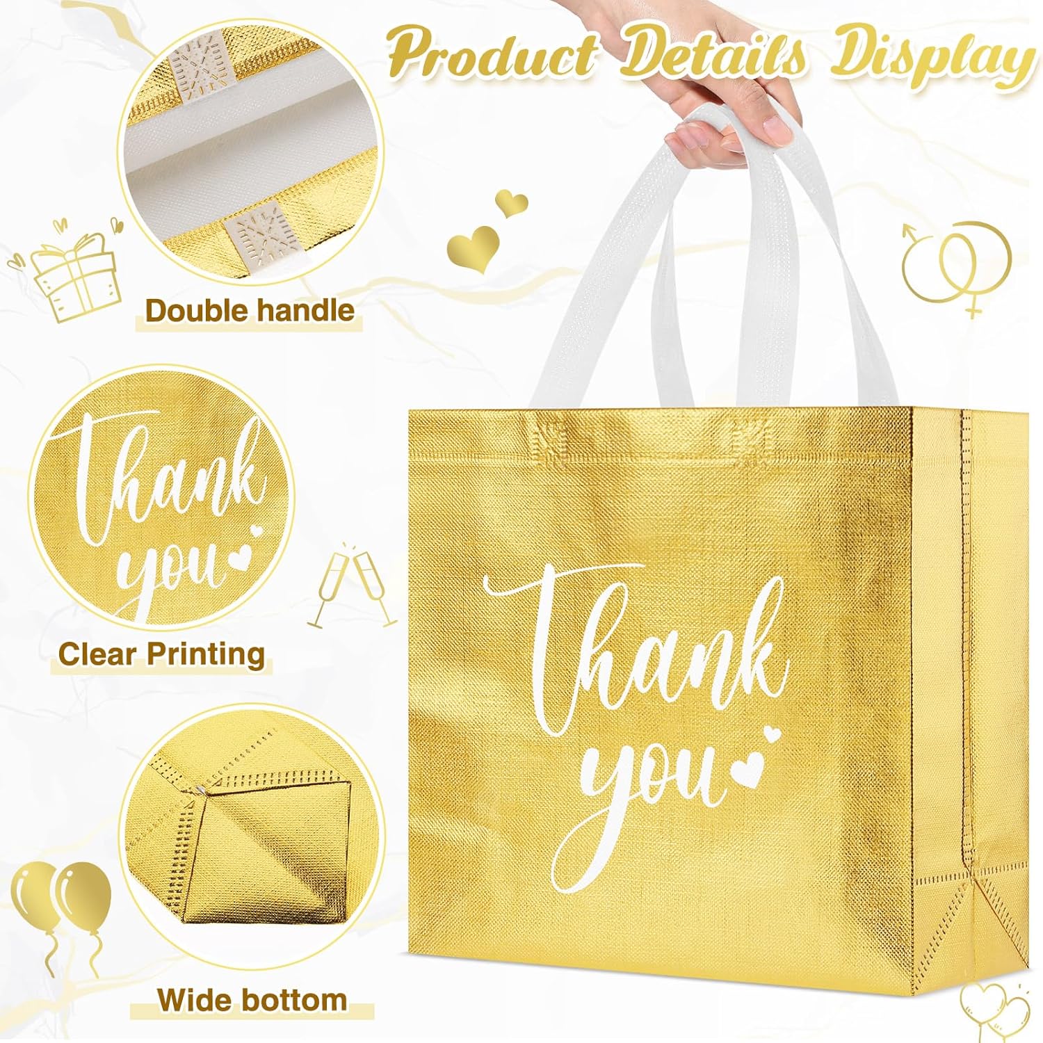 - Applicable for Parties and Daily Life: these thank you tote non woven bags are ideal for weddings and bridal showers, also suitable for birthday parties, baby showers, Thanksgiving, graduation ceremonies, afternoon tea parties, business banquets and other occasions; There is a large enough capacity to hold gifts, jewelry, lipstick, souvenirs, toys, clothes, snacks, candy and more, providing you and your guests with a wonderful party atmosphere