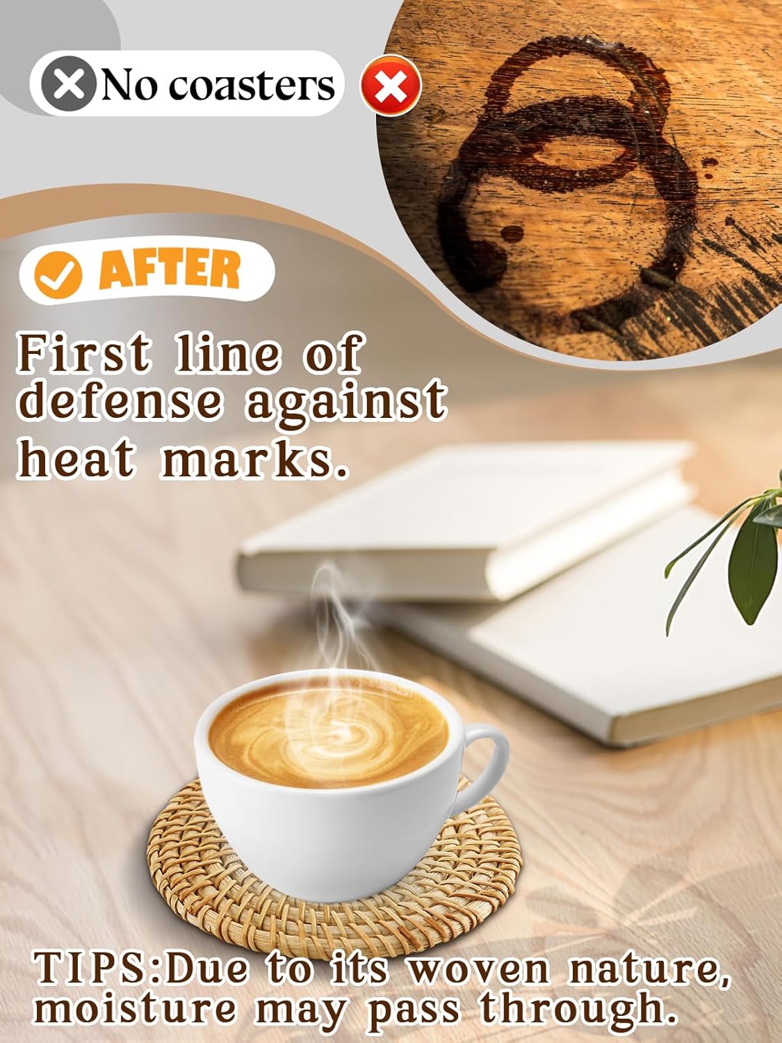 - Heat Resistant: The natural rattan woven coasters aren't just visually appealing; they also offer excellent thermal insulation. They effectively shield your desktop from heat, preventing damage from hot drinks. Enjoy your hot beverages in winter without worry.