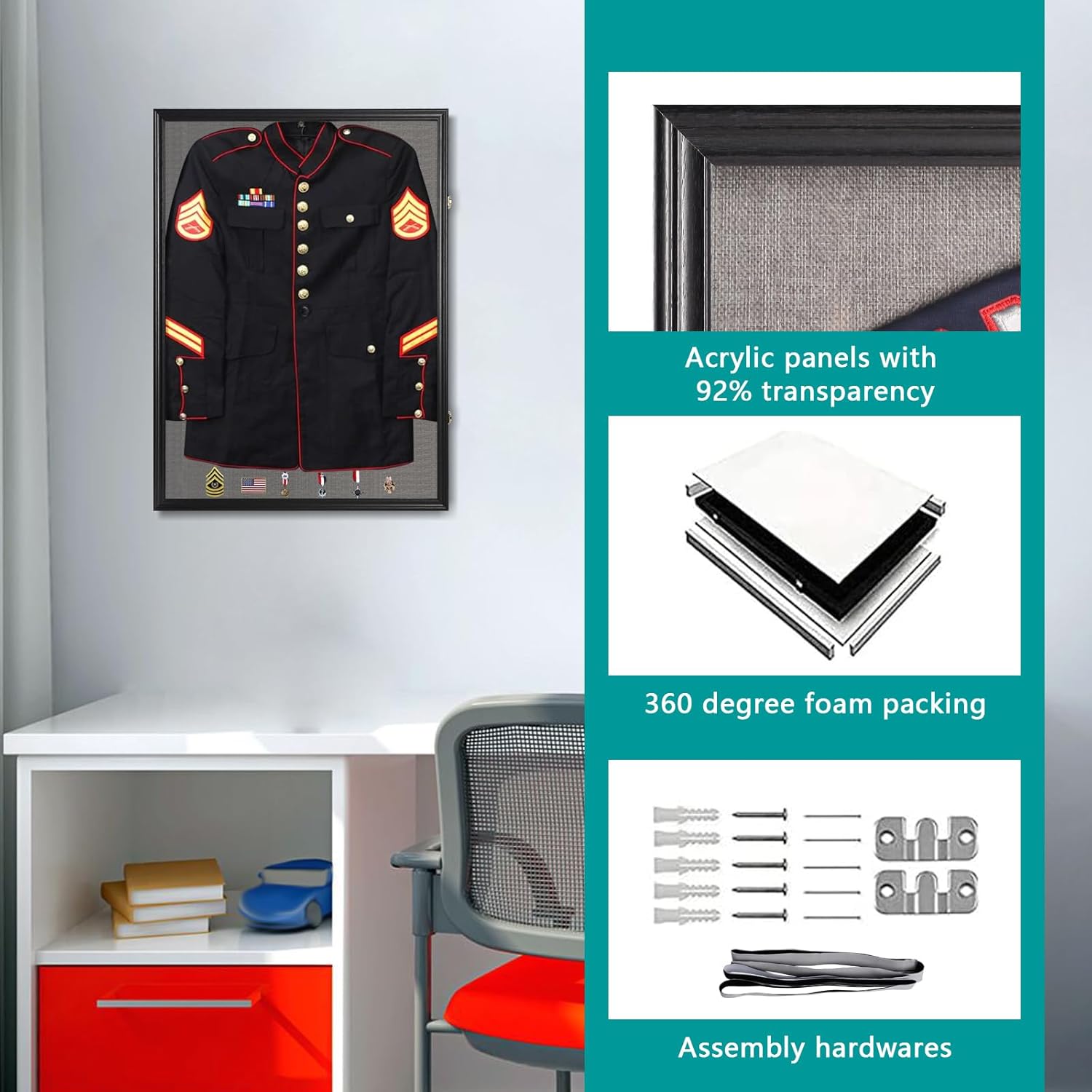 - STRONG PACKAGING & WHAT'S INCLUDED - It is strong and safe package with foam inside the carton.The package includes: Jersey Display Frame(x1); Hanger(x1); Pin Board(x1); Hanging Hardware; Silver Thimble and pins; visual user manual(x1).