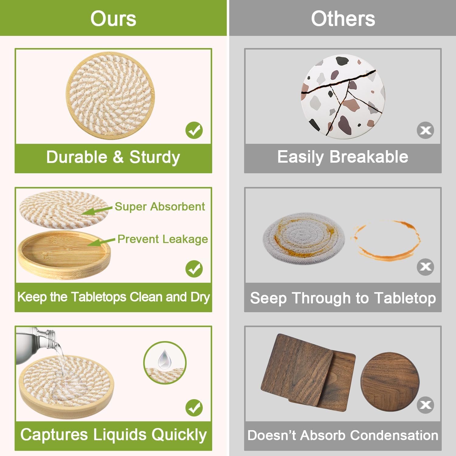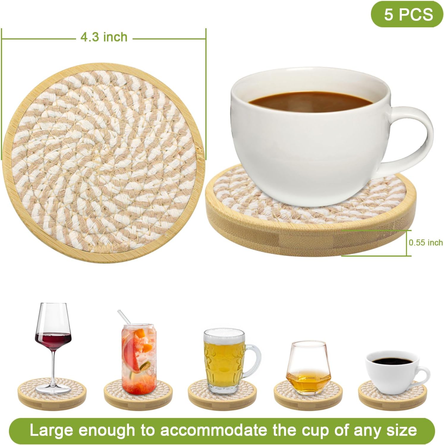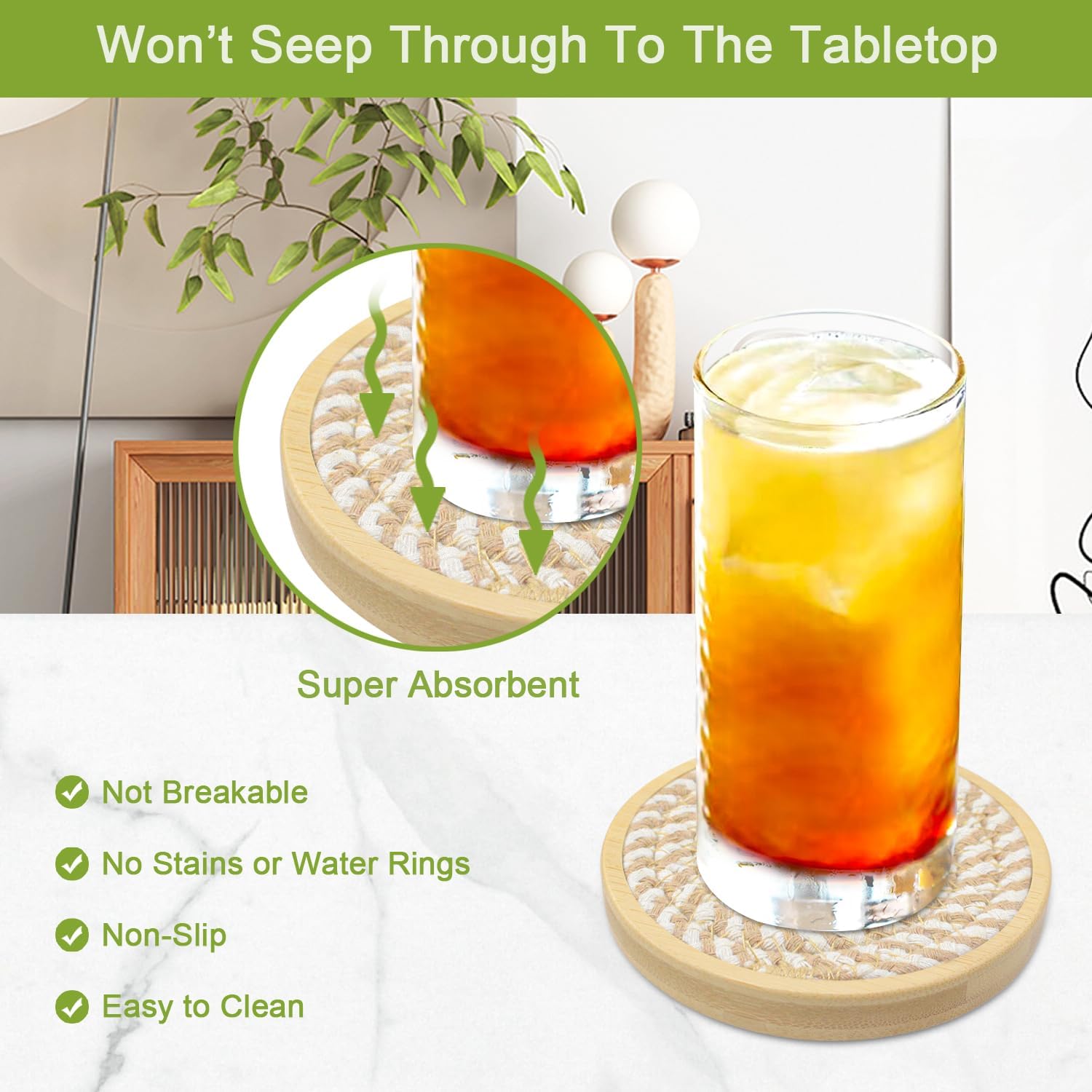 - 🍷Easy to Clean: Just get out the woven coasters, rinse coasters with water, and hang them up to dry; Diameter 4.3 inches, larger and thicker than other coasters, and fit for kinds of cups, reusable round coasters come with great gift packing bag, perfect for housewarming and kitchen gifts.