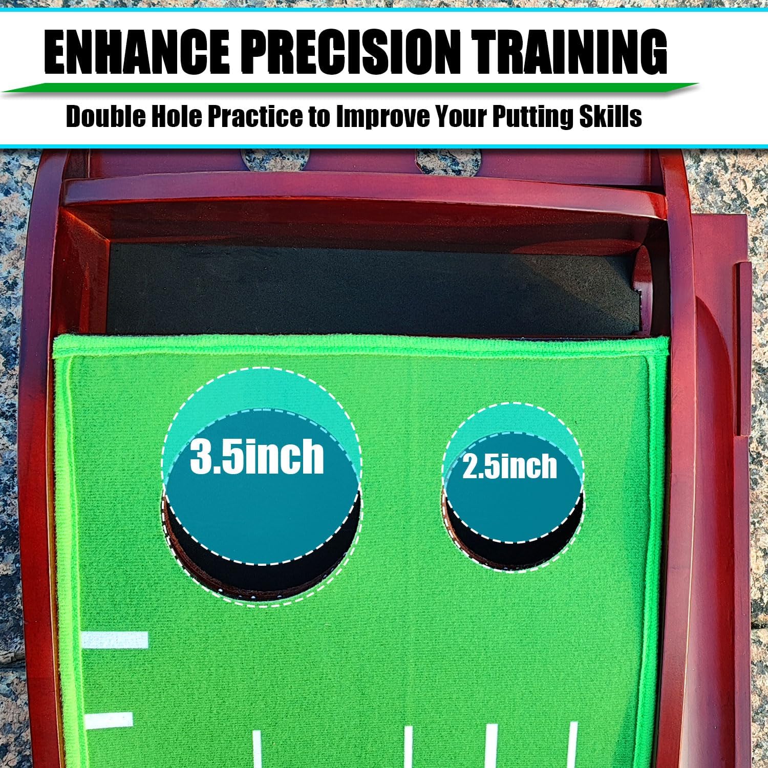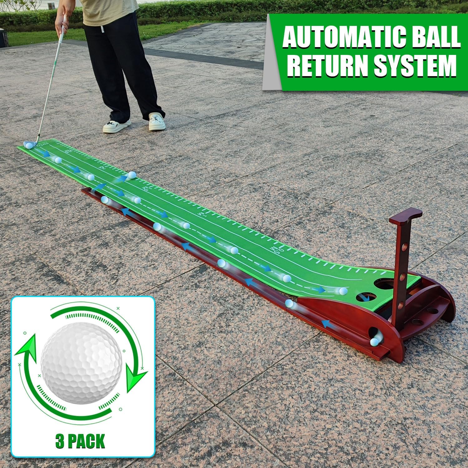 - -Packing list: This perfect practice putting mat contains 1 x Wooden Base with ball returning rails , 1 x golf putting mat, 1 x Golf Club Baffle, 3 x Golf Balls. Simply lay the mat on a flat surface, attach the base and magnetic return track, and you're ready to start practising your putting.