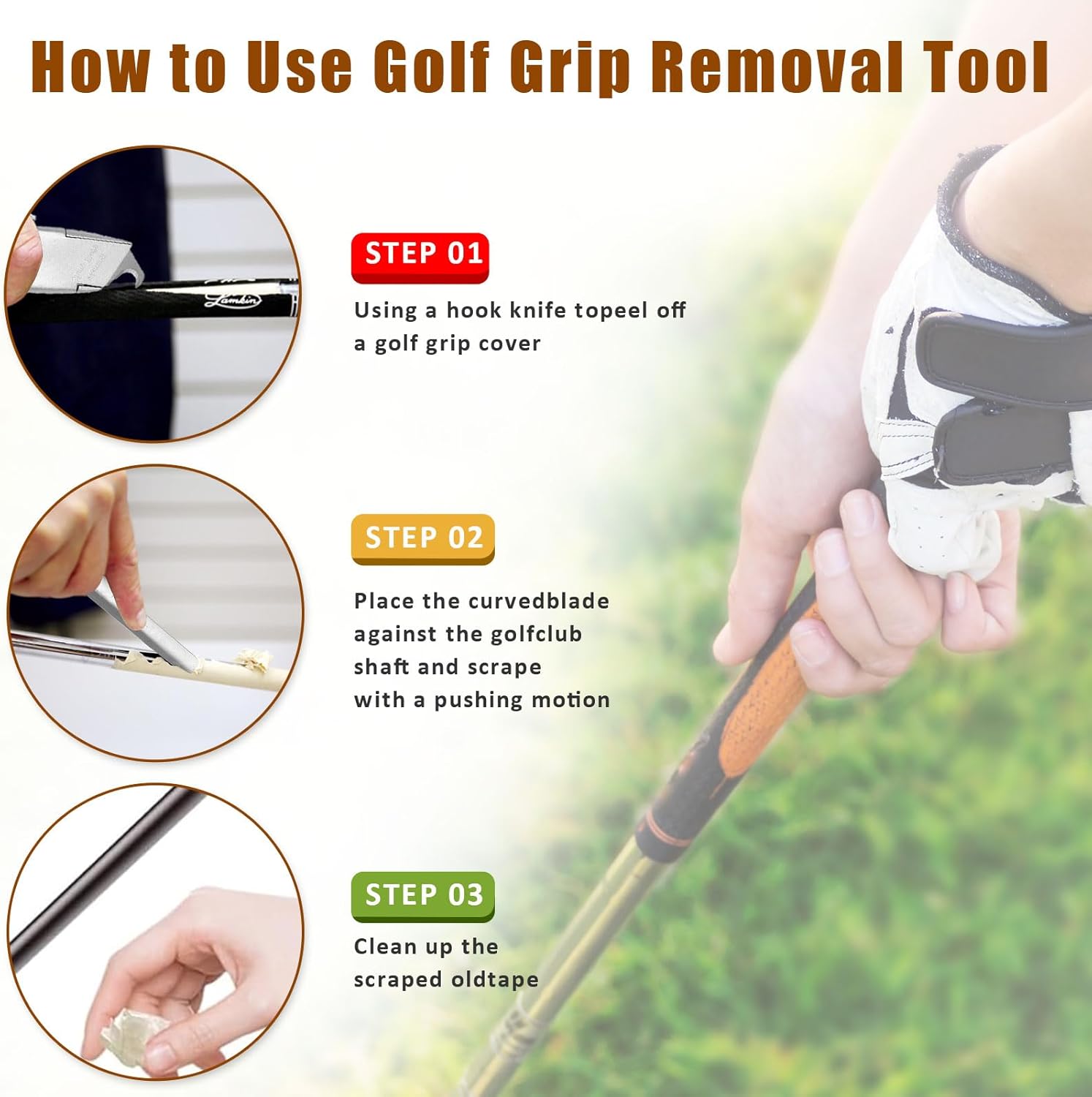 • Package Contents: 1 golf grip removal tool measuring 9.3IN and 1 golf grip tape hook blade tool measuring 6.14IN