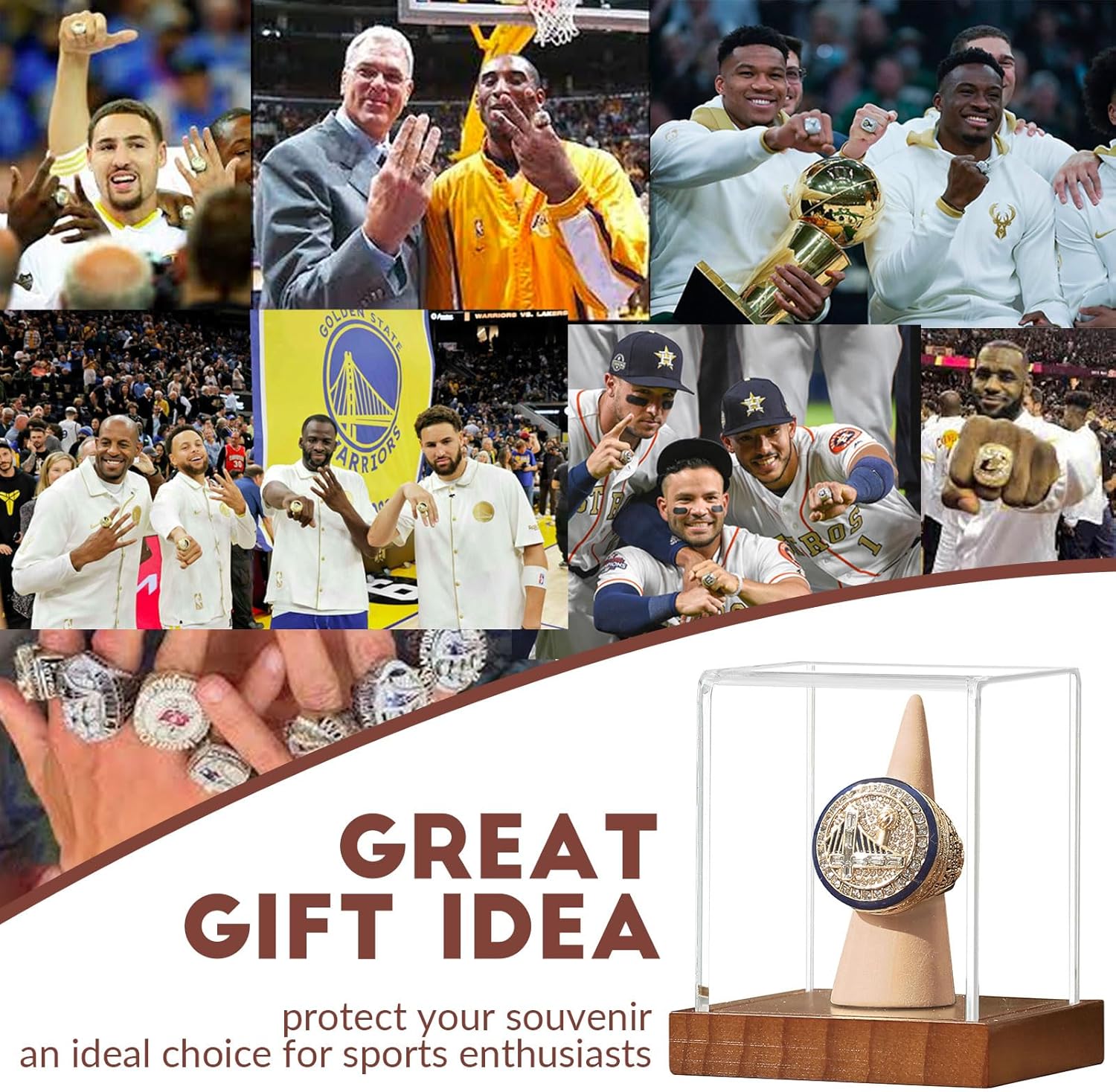 JupDec Championship Ring Display Case, Clear Acrylic Single Ring Holder with Wood Stand Base for Sports Basketball Baseball Fan Souvenirs Military, UV Protection