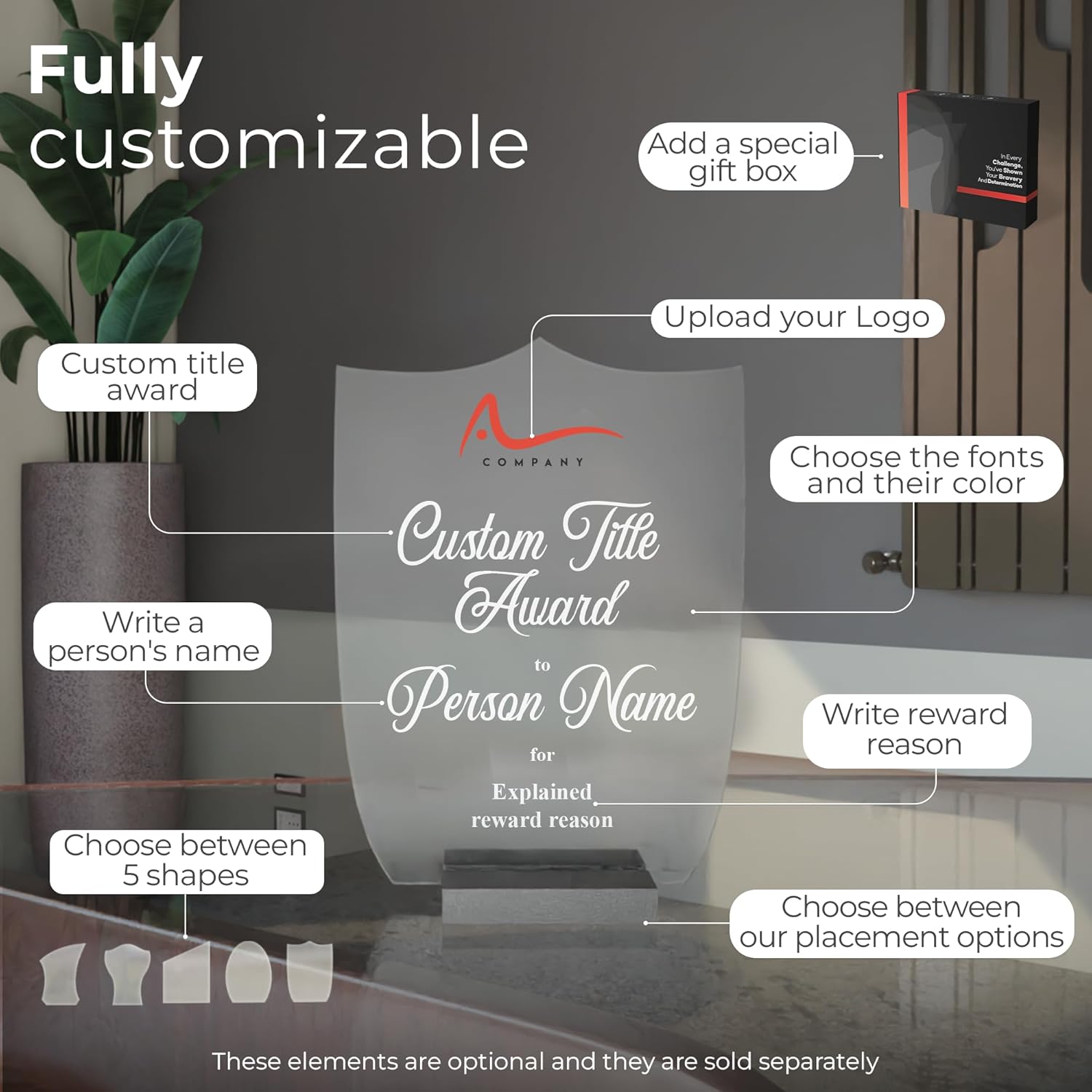 - Elegant Custom Trophy with 5 Shape Options and Logo — Choose from 5 refined shapes and upload your company logo to personalize your trophy plaque. Whether used as a trophy award for leadership, teamwork, or staff appreciation gifts, this design delivers sophistication and strong brand identity.