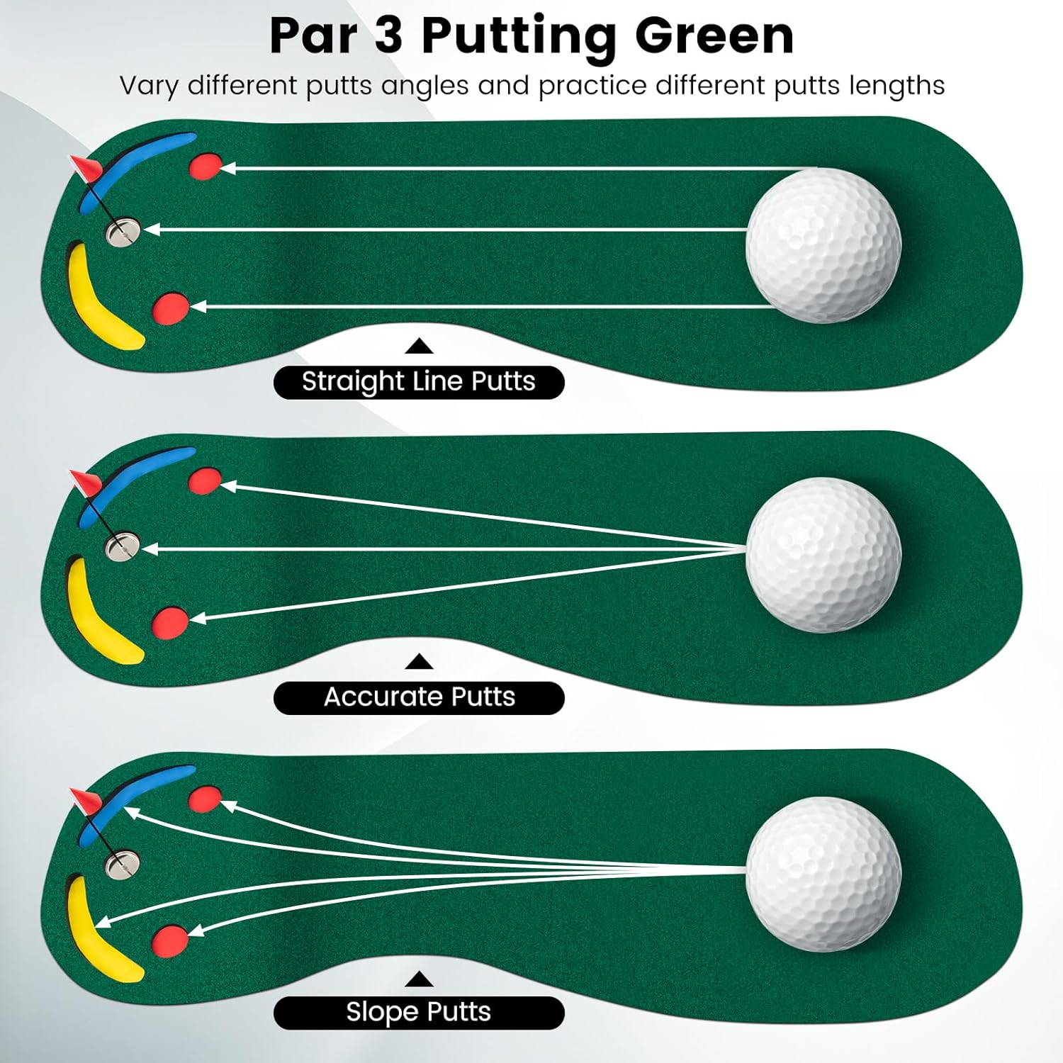 - Improve Your Putting Skill: Multiple cup targets effectively help you to vary different putts angles and allow you to practice different putts length. And the putting mat has a slight incline at the end to improve firmness of stroke.