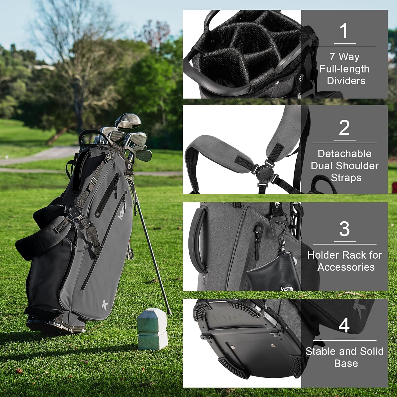 - 7-Way Full-Length Dividers and 3 Lift handles: With 7 full length dividers, the stand bag can keep your clubs in order and protect them away from scratches. 3 Lift handles on top, front, middle and lower front of the bag which assist you transport the clubs with ease.