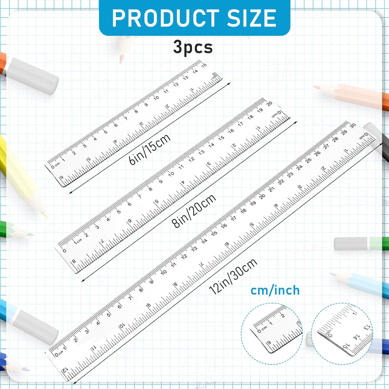3 Pack 6 Inch 8 Inch 12 Inch Ruler Set Plastic Straight Ruler Transparent Measuring Tool Acrylic Clear Ruler for School Office Student
