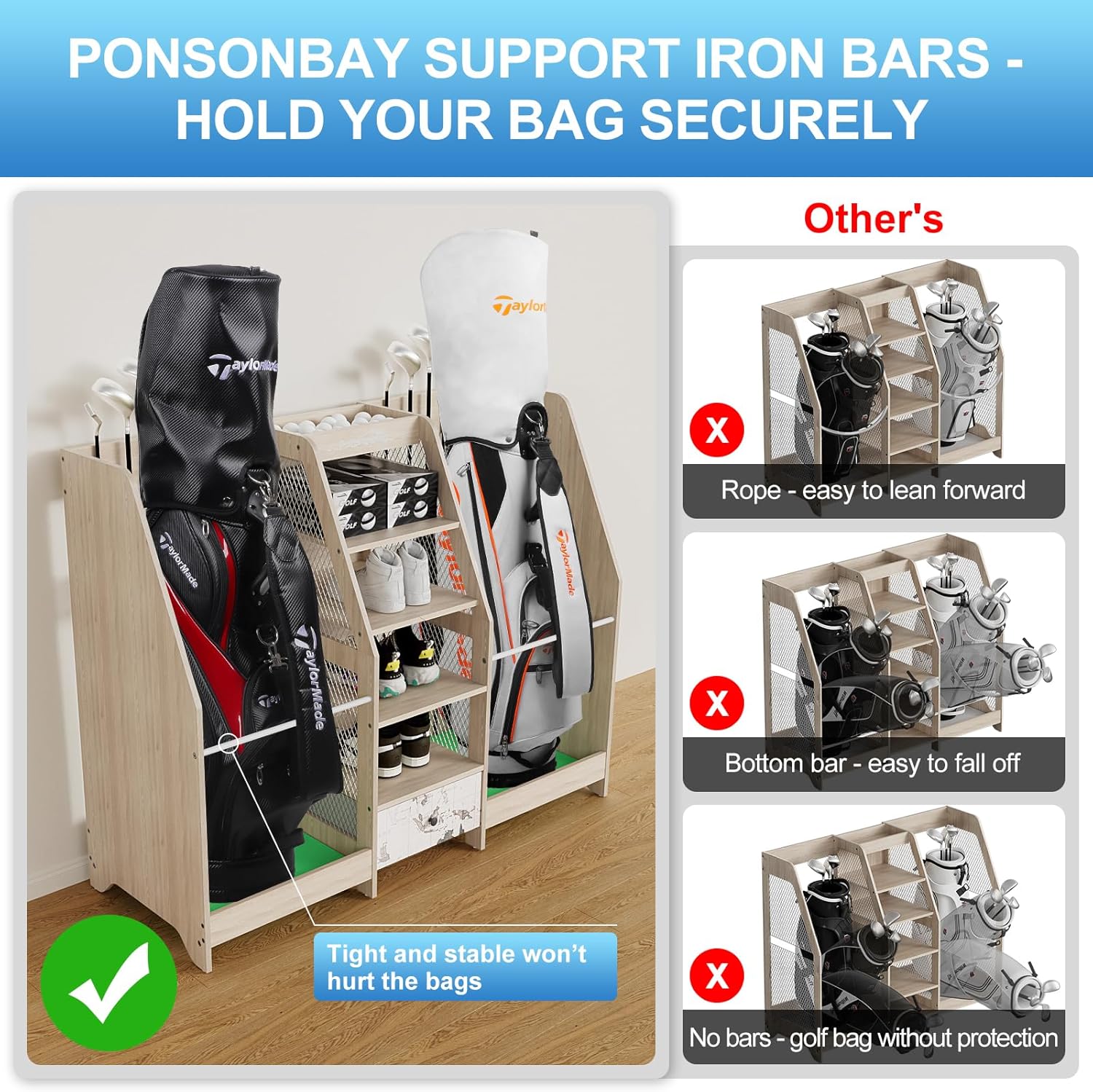 - High Storage Capacity: Ponsonbay golf bag storage rack is the most spacious rack on the Amazon market. It can hold 2 x golf bags, 12 x clubs, 4 x shoes, 50 + golf balls, many golf apparel, gloves, and hats
