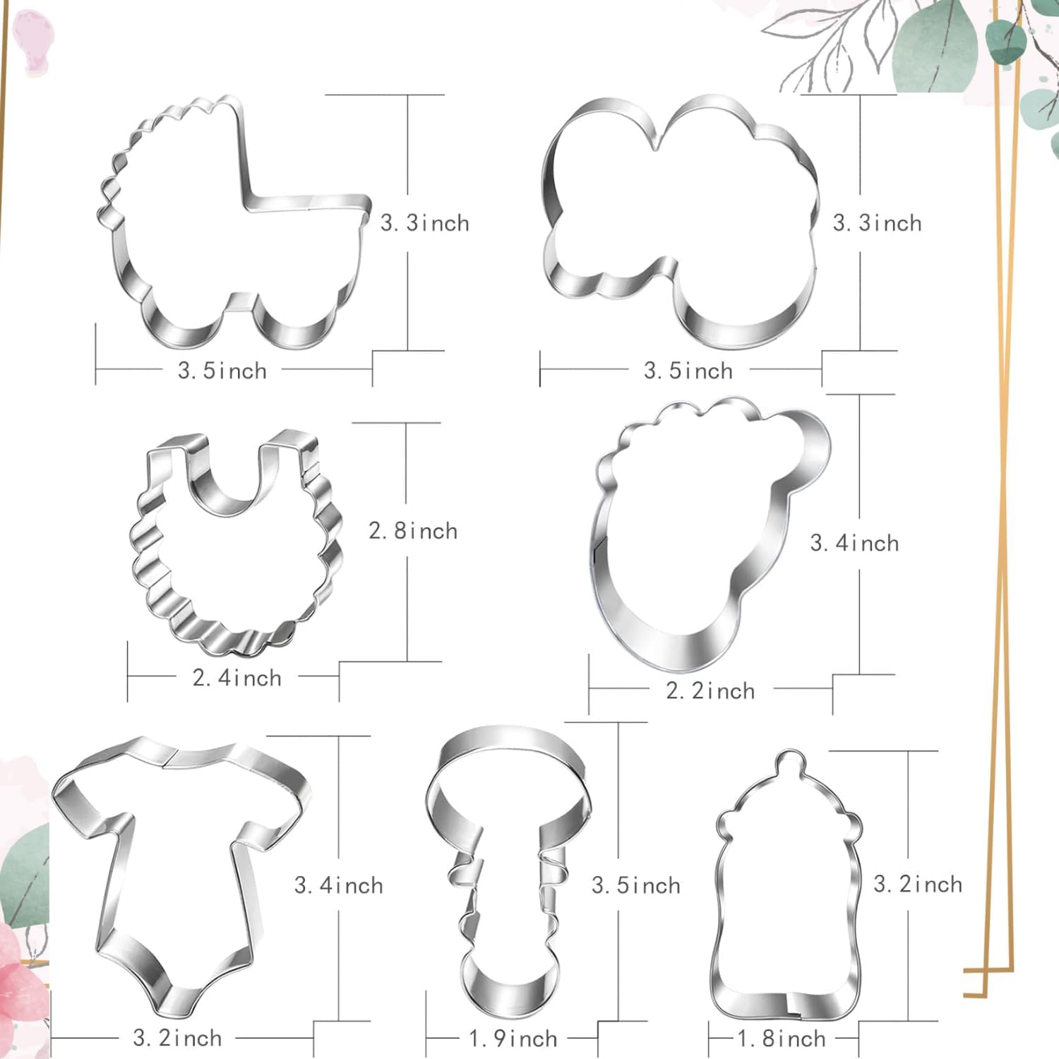 - Package:7 assorted shapes cookie cutters, Baby Onesie, Bib, Rattle, Baby Bottle, Baby Carriage, Foot and Baby Word Plaque.Deep 1 inch.Great size for the sugar cookies decorating.