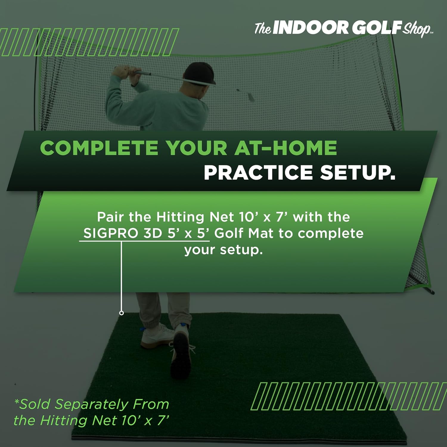 - Pair Golf Practice Net and Mat: Complete your at-home setup with the SIGPRO 3D 5' x 5' Golf Mat. Like the Hitting Net 10' x 7', this golf mat is suitable for indoor and outdoor use. You can work on your game wherever and whenever you want by combining The Indoor Golf Shop's golf net and mat.