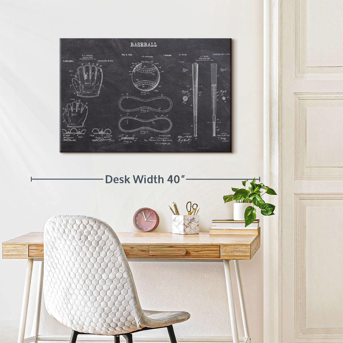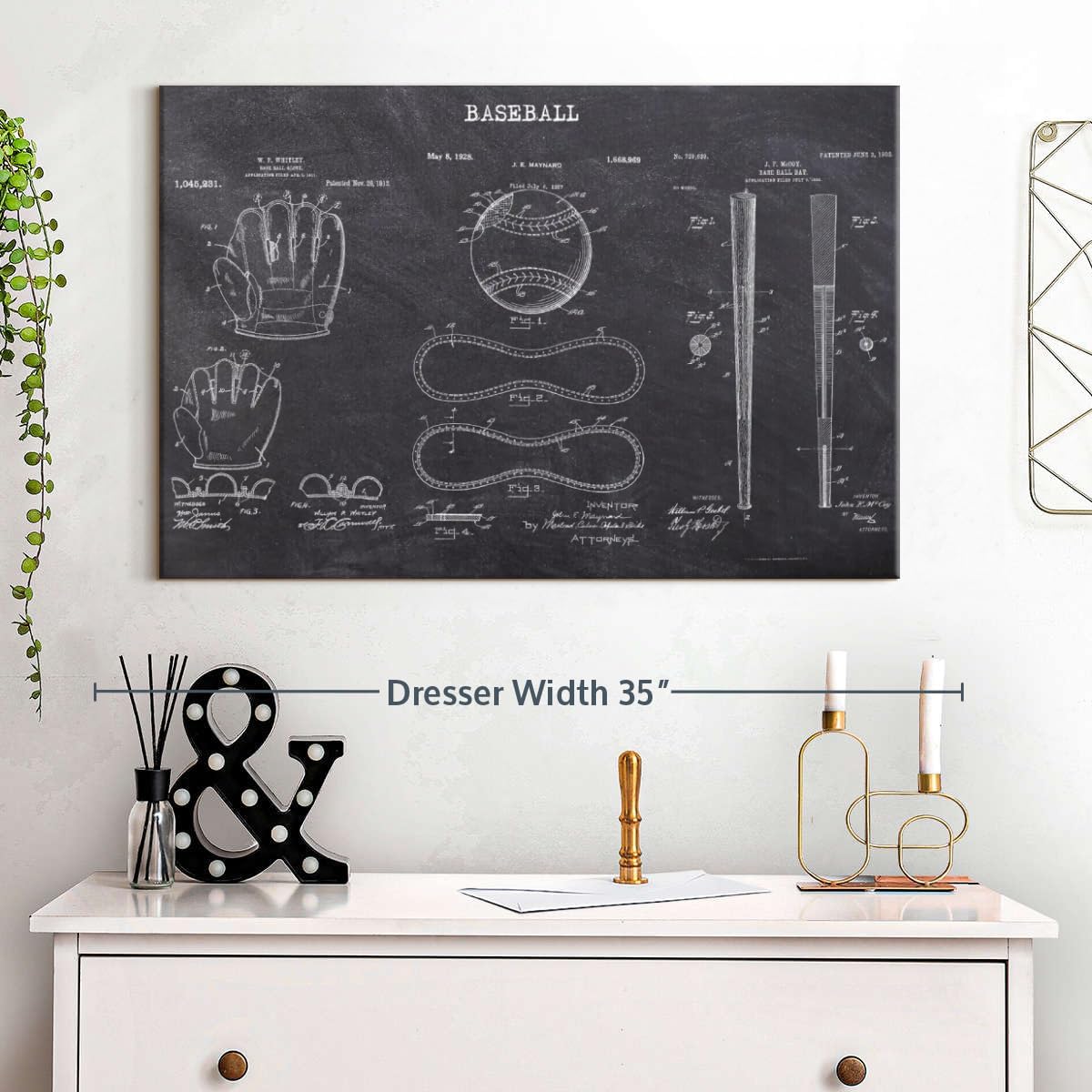 - Baseball Patent Art- Our patent prints and wall art for the office feature a black and white blueprint of the baseball bat, gloves, and ball. Make your room designs more interesting with our vintage and unique sports decor for the boys bedroom.
