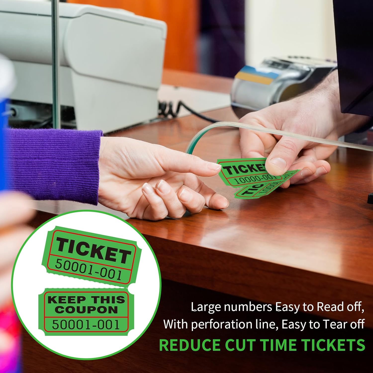 - Rolls of 1000 double stub raffle tickets, with consecutively numbered and Perforated line ,easy to use save to time-green