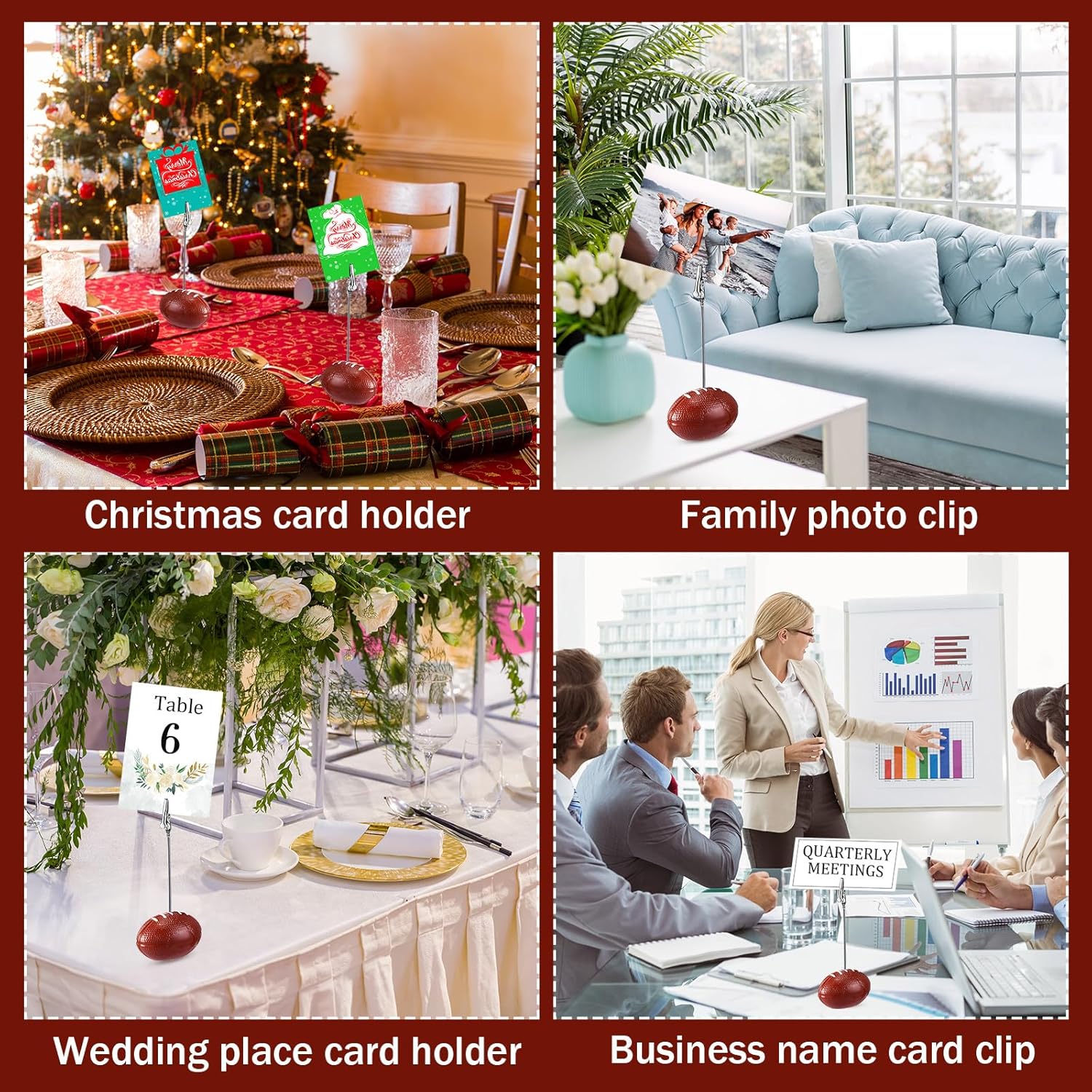 - Robust Design Features: each photo card holder presents a sturdy crocodile clip at the top of the sports ball base; The feature of these table place card holders ensure your cards and photos remain upright, without any risk of falling over; The resin material gives the sports ball base holder adequate weight to keep it steady on your table, allowing it to efficiently perform its display and decor tasks