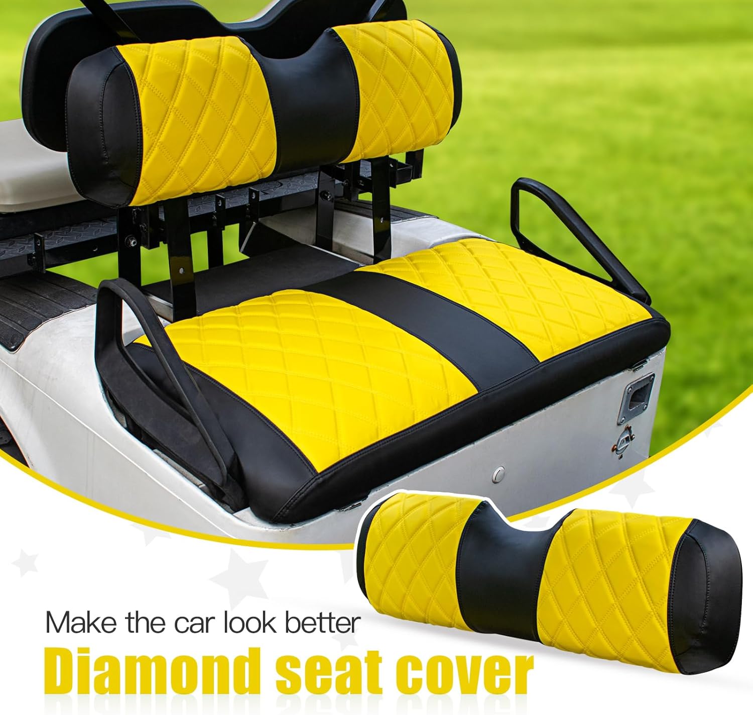 - 【Diamond Appearance Design】Golf cart front seat cover with diamond appearance design adds a touch of luxury and elegance to your golf cart, which will surely turn heads on the course. Premium and durable PVC vinyl leather brings ultimate enjoyment and comfort to your golf cart.