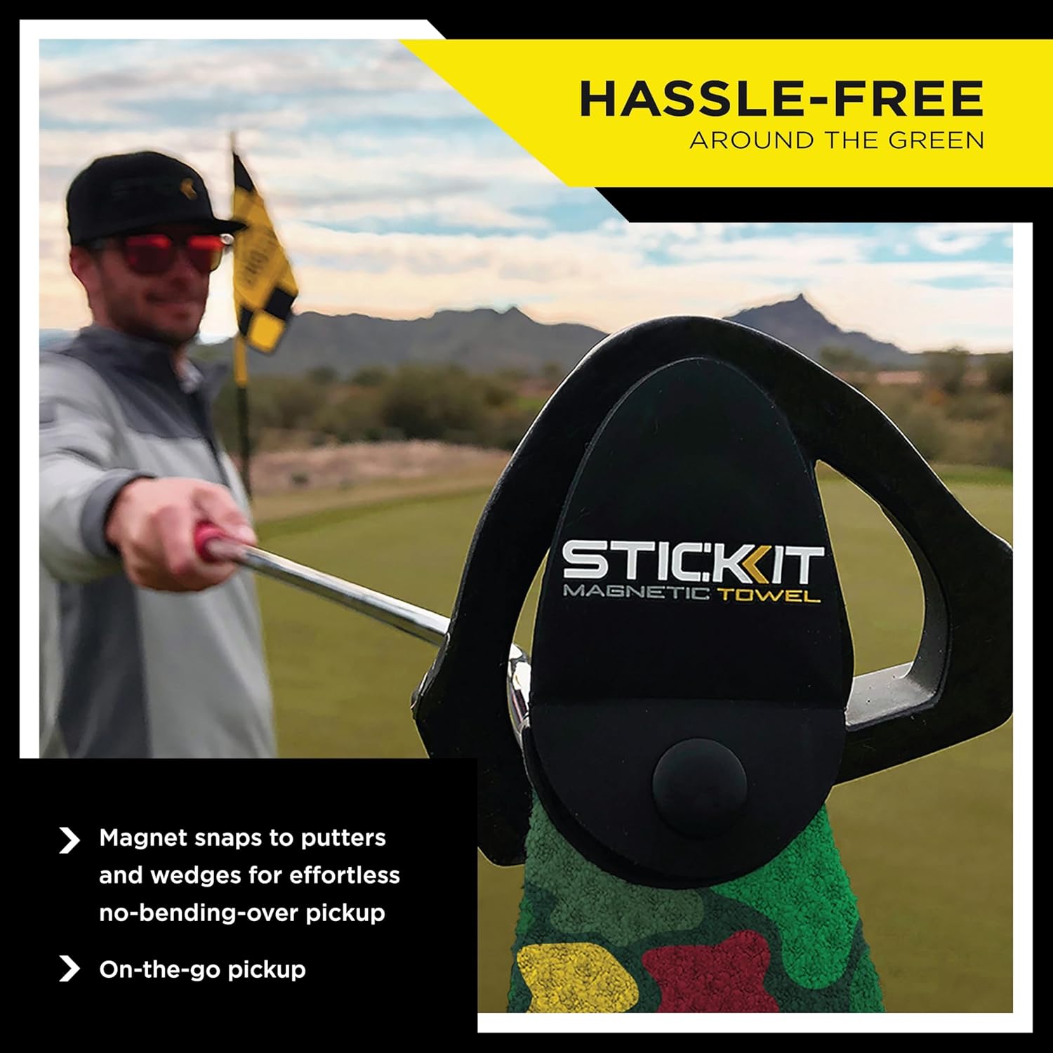 - ON-THE-GO MOBILITY β Snaps to irons, wedges, and putters for fast, on-the-go pickup around the green. Monument Golf created the STICKIT with the optimal towel size for use from tee-to-green