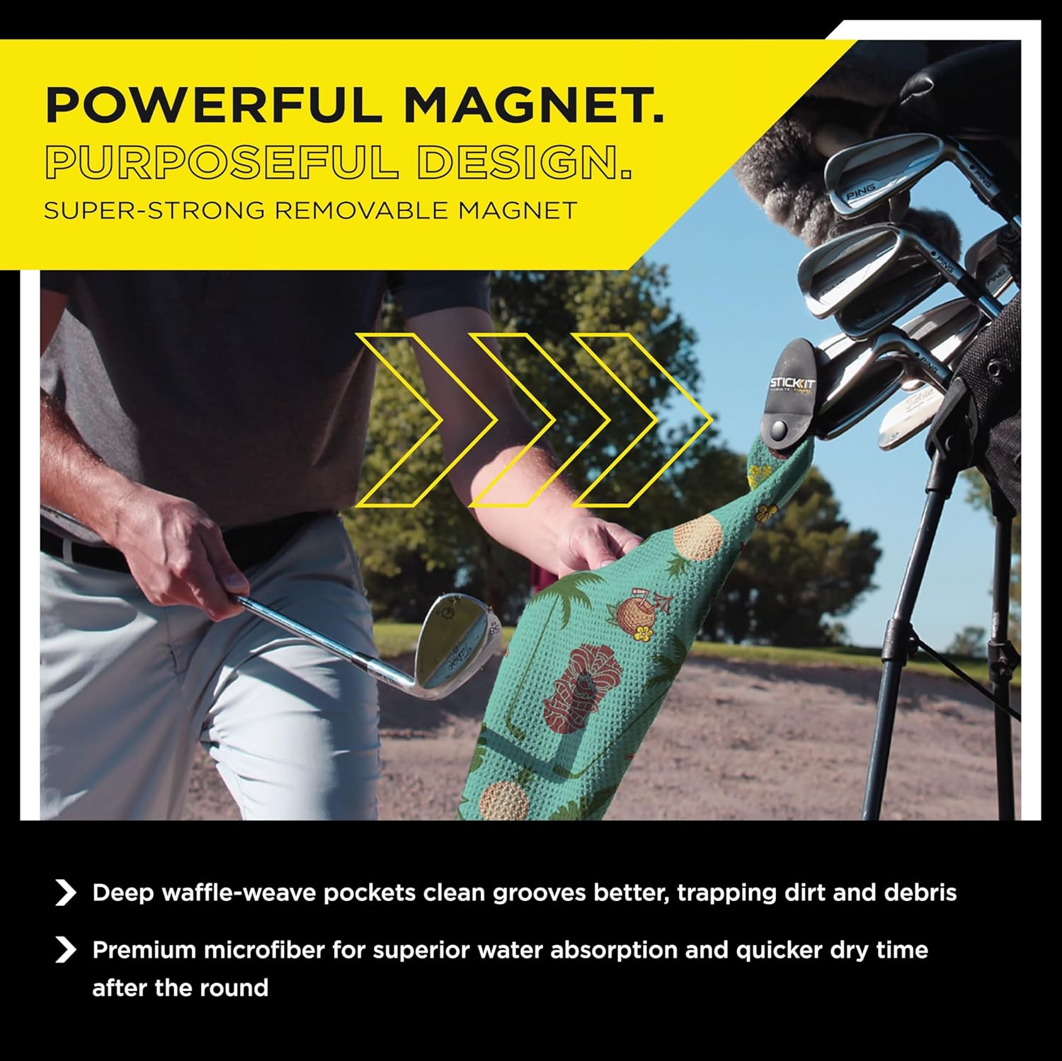 - ALWAYS WITHIN ARMβS REACH - The Tiki STICKIT Magnetic Towel is the ultimate GRAB-N-GO Golf towel. The powerful magnet offers ultimate convenience. Stick it on your Golf Cart, Golf Clubs, or any conveniently placed metal object