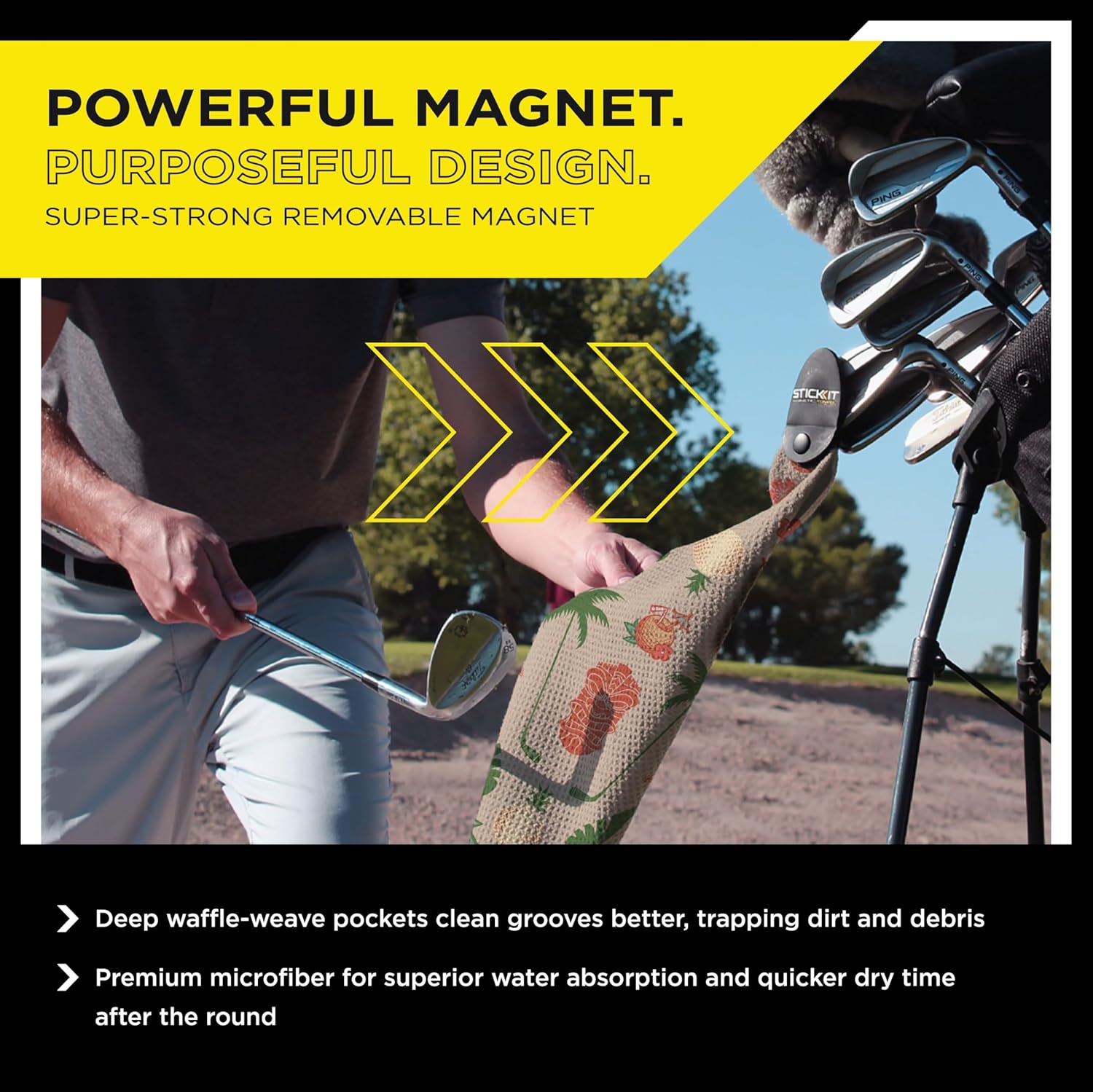 STICKIT Magnetic Sandy Tiki Golf Towel | Top-Tier Microfiber Golf Towel with Deep Waffle Pockets | Industrial Strength Magnet for Strong Hold to Golf Carts or Clubs