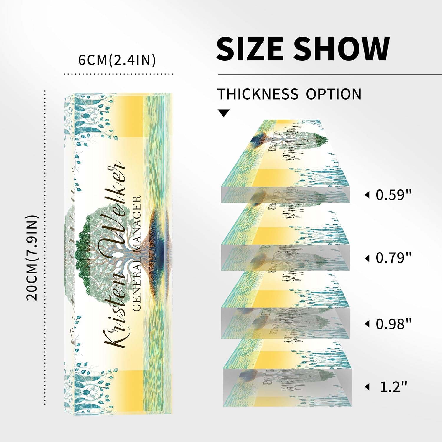 - Desk Name Plate Personalized: We offer 4 name plate thicknesses 0.59, 0.79, 0.98, 1.2 inches thick and a variety of styles for you to choose from ensure your desktop name plate matches your brand's aesthetic and your own personal sense of style, Eye-catching on any desk or bookshelf, this office nameplate can also be used to decorate a desk, give the office a professional look, and communicate important information to clients and employees, And we will update more new styles from time to time.