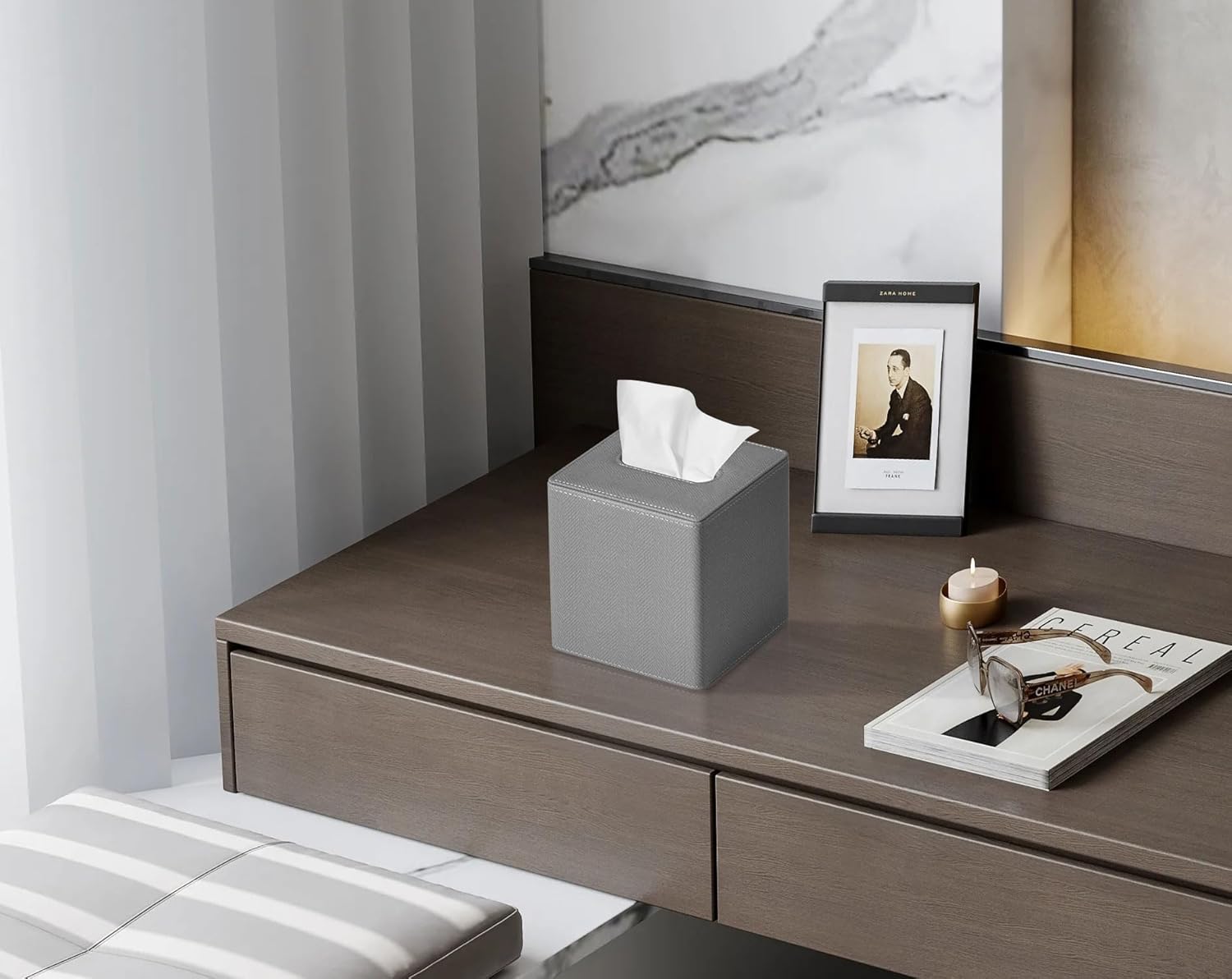 Tissue Box Cover Square PU Leather Facial Tissue Box Holder for Dresser Bathroom Decor (Linen Grey)