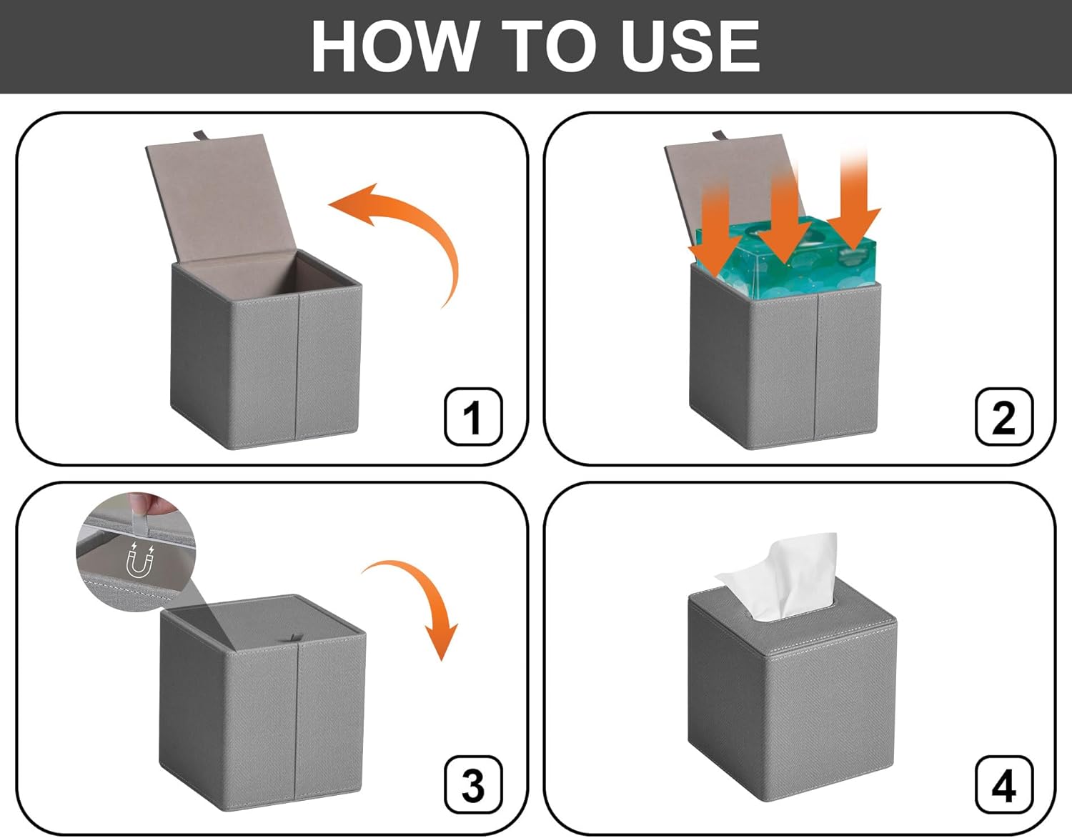 - Easy Refills: Finely crafted tissue box with a convenient magnetic closure at the bottom- makes it easy to open and the magnetic closure is very strong, napkins will not fall out when you move it.