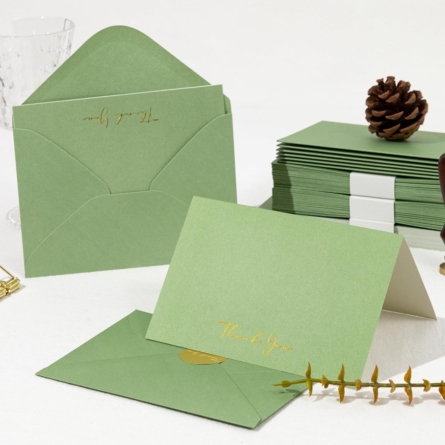 - Elegant Design: Elevate your gratitude with this exquisite set of 4x6 thank you cards with envelopes, featuring elegant green hues. Each thank you card is adorned with luxe gold foil 'thank you' script at the base—a timeless touch for weddings, gifts, or heartfelt notes