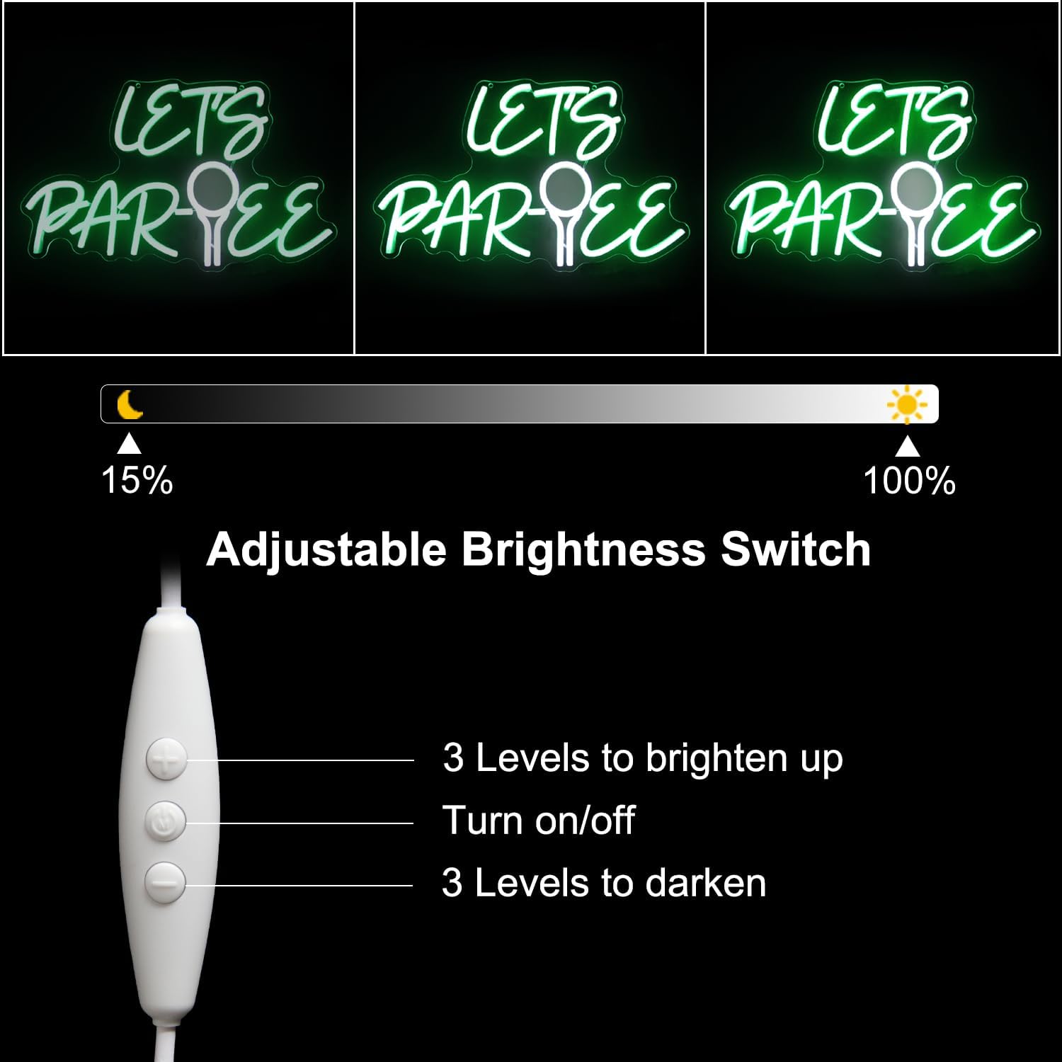 - 【Dimmable Neon Sign】The Let's Par-tee neon sign is equipped with a super-intelligent dimming system, which can meet different lighting needs. The middle button to turn ON/OFF the neon light sign, the UP and DOWN buttons to adjust the brightness of neon lights. The brightness of neon wall sign can be adjusted according to your preferences and ambient light.