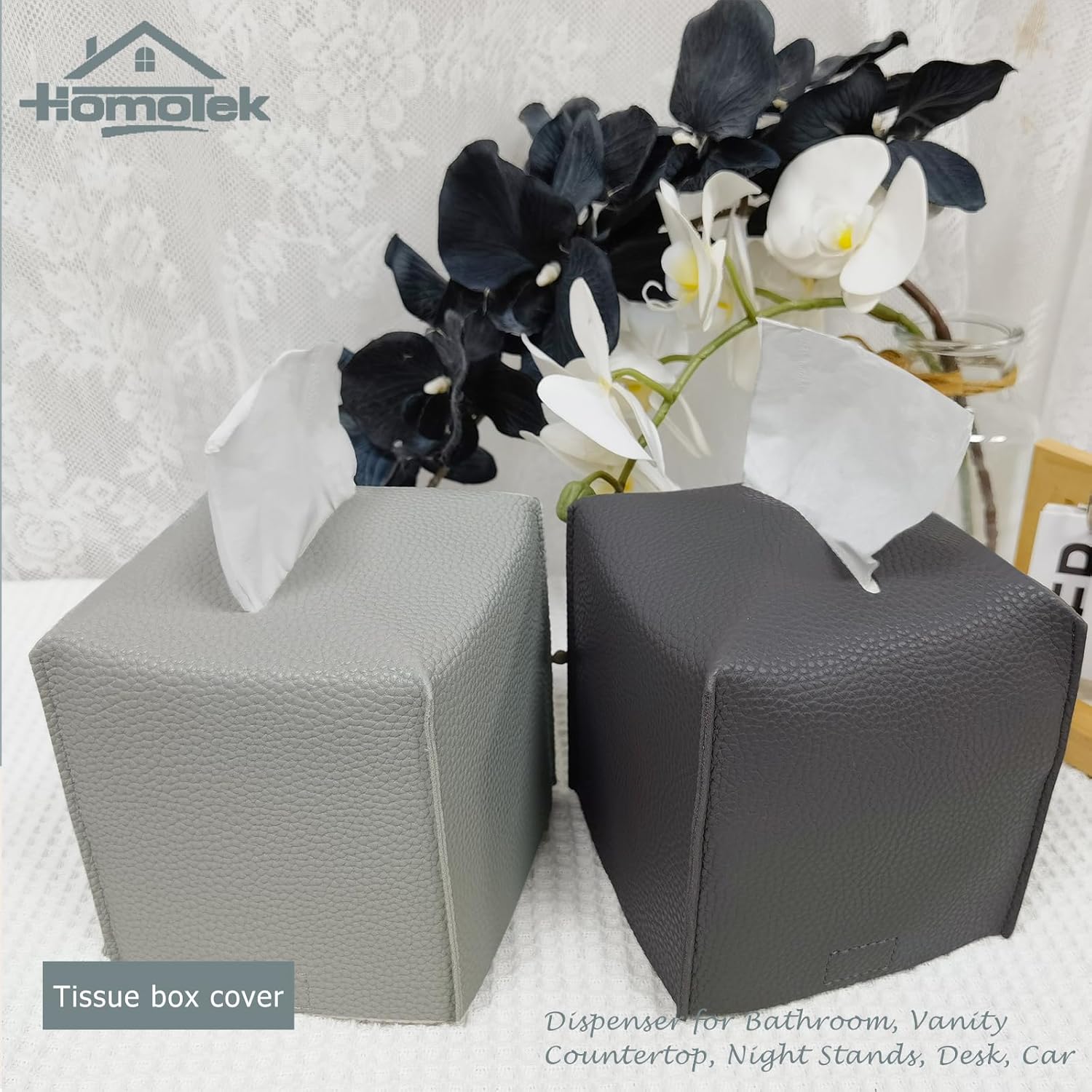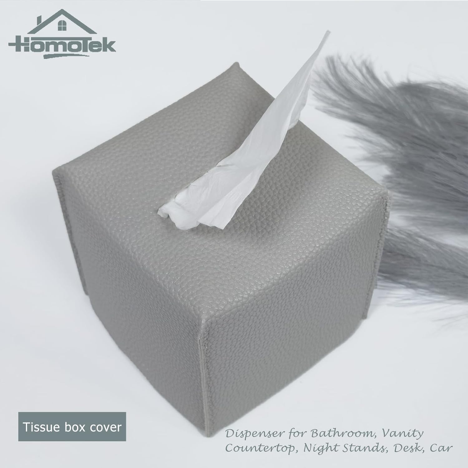 HOMOTEK 2 Pack Tissue Box Cover, Square PU Leather Tissue Holder, Decorative Facial Tissue Cube Paper Organizer Dispenser for Bathroom, Night Stands, Desk, Car 5X5X5'' - Light Gray, Pebble Grain