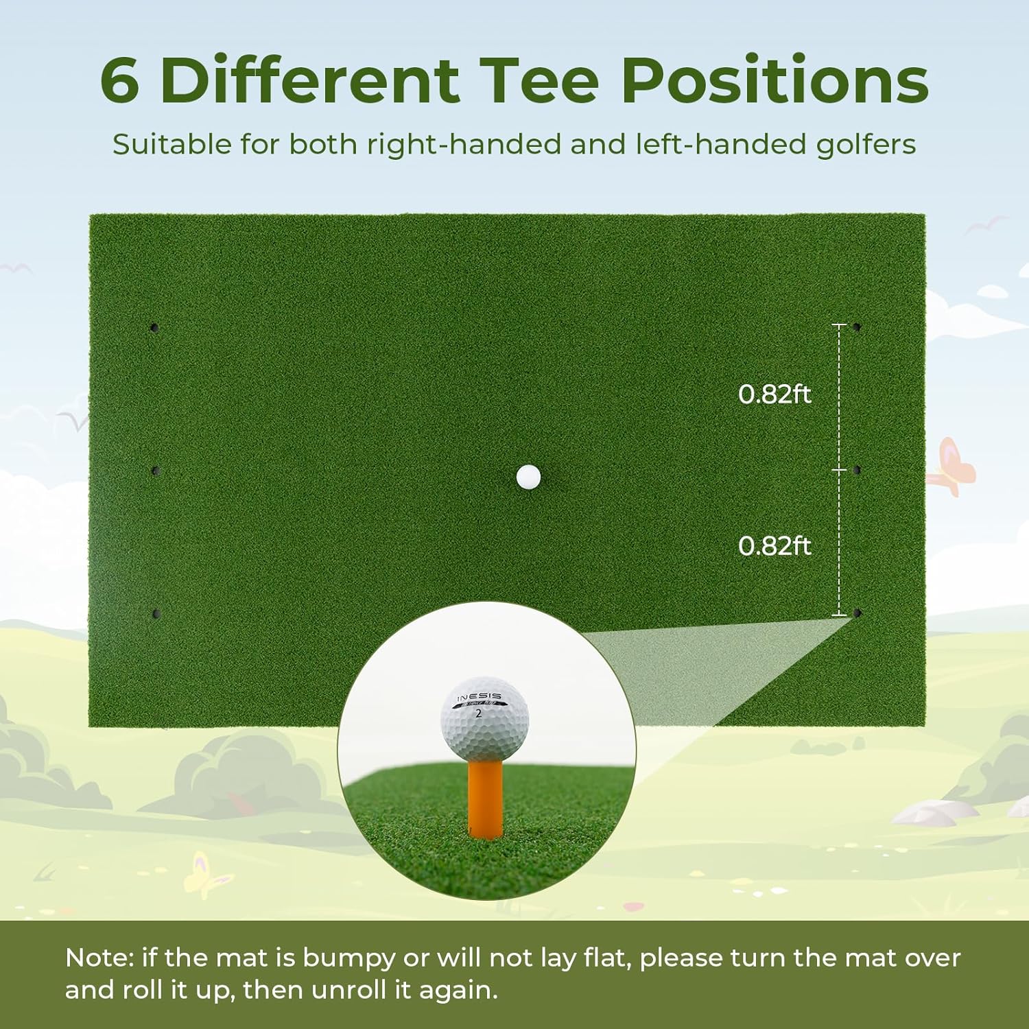 - ⛳【2 Alignment Sticks& 6 Ball Tee Positions】 The golf practice mat comes with 2 golf alignment sticks, which help straighten your golf swing. In addition, there are 6 different tee positions on the mat to meet various training needs. It is suitable for both right-handed and left-handed golfers.