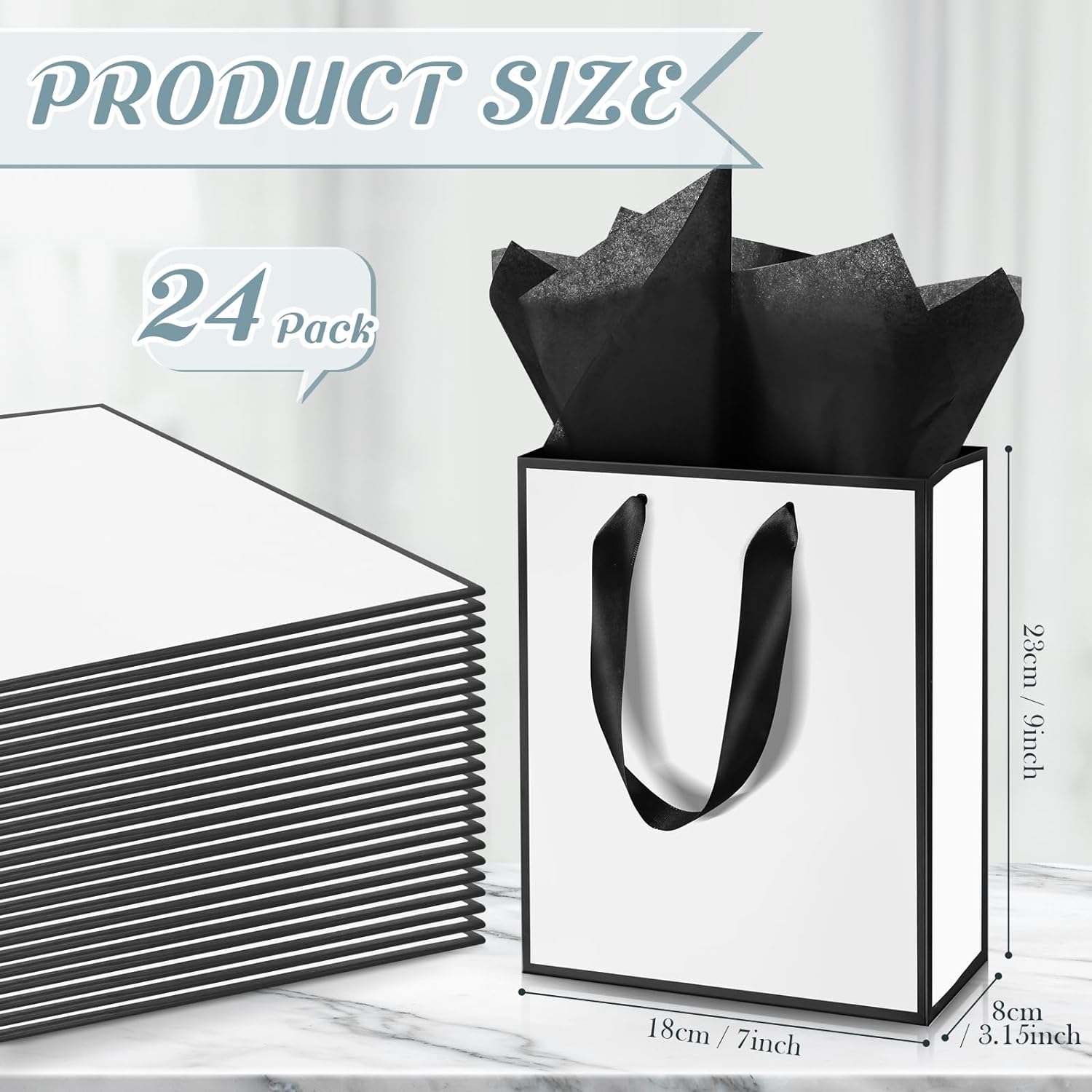 Yeaqee 24 Pack Metallic Paper Gift Bags with Handle and Tissue 9x7x3.1 Gold Foil Welcome Favor Bags Return Gifts for Wedding Fall 5 Senses Christmas Bridesmaid Birthday(White Black)