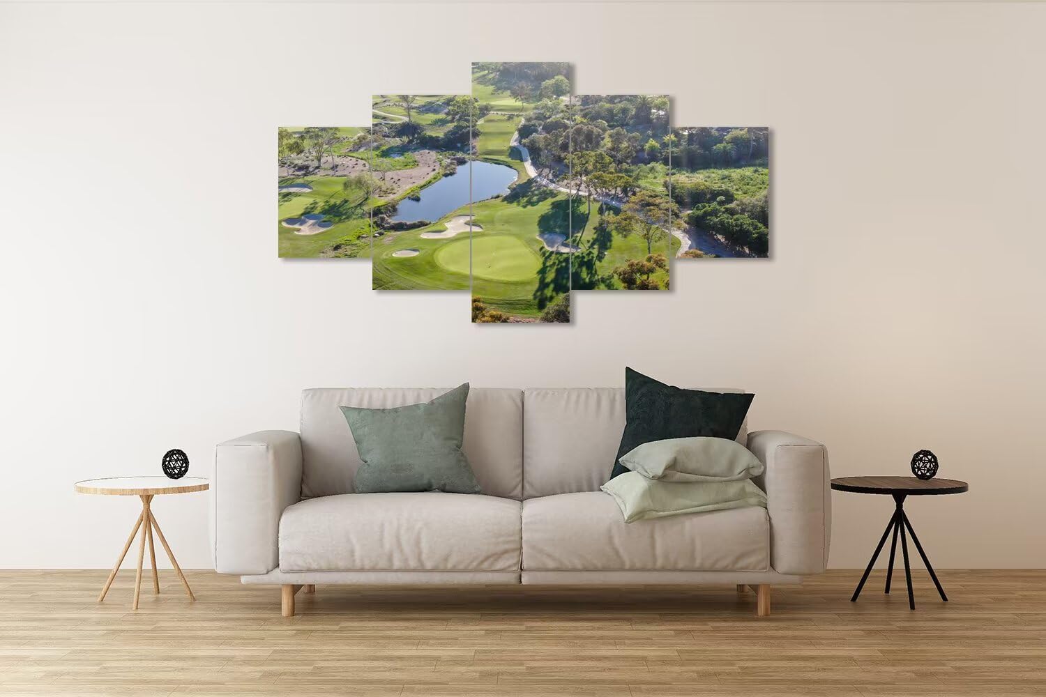 - 💝Golf course wall art size: 60Wx40H inch. Each panel size: 12x20inchx2,12x28inchx2,12x40inchx1,golf canvas prints easy ready to hang.