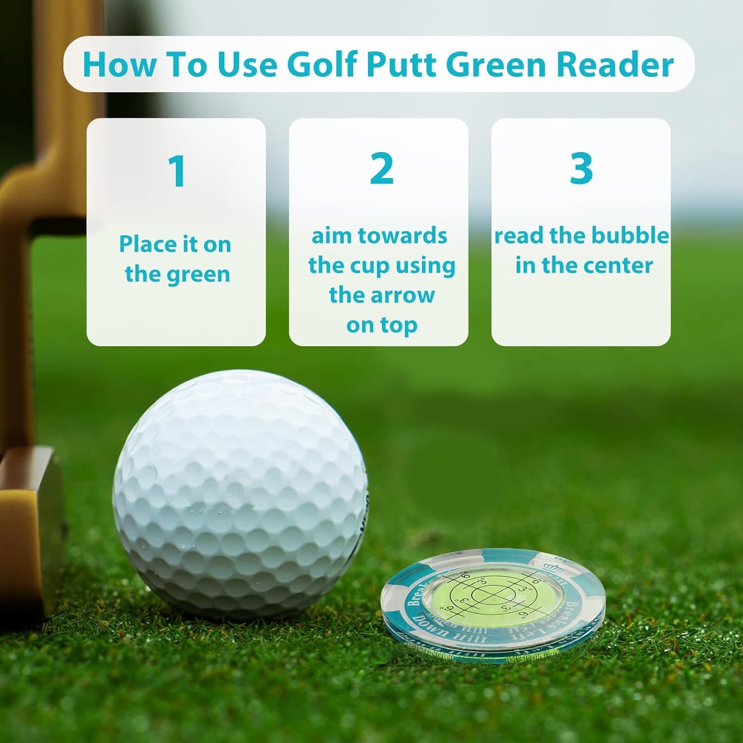 - Green reading process in 3 easy steps: 1.Place it on the green, 2.aim towards the cup using the arrow on top 3. read the bubble in the center. It not only visualizes slopes such as uphill, downhill, and breaks but also provides precise angle measurements. Within a 5 ft putt, measuring behind the ball yields optimal results, while multiple points are recommended for longer putts.