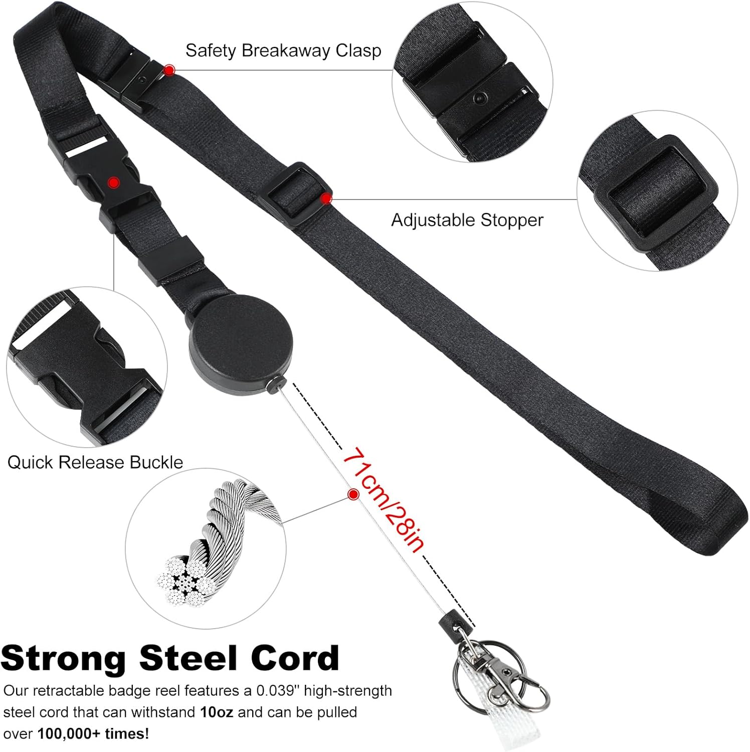 - Lanyard Convenience: The retractable badge reel is made of ABS casing and is weatherproof. It is securely attached to the badge lanyard which is soft and comfortable to wear. The safety breakaway clasp can be released when the lanyard gets pulled or snagged by accident and can be reconnected after disconnection