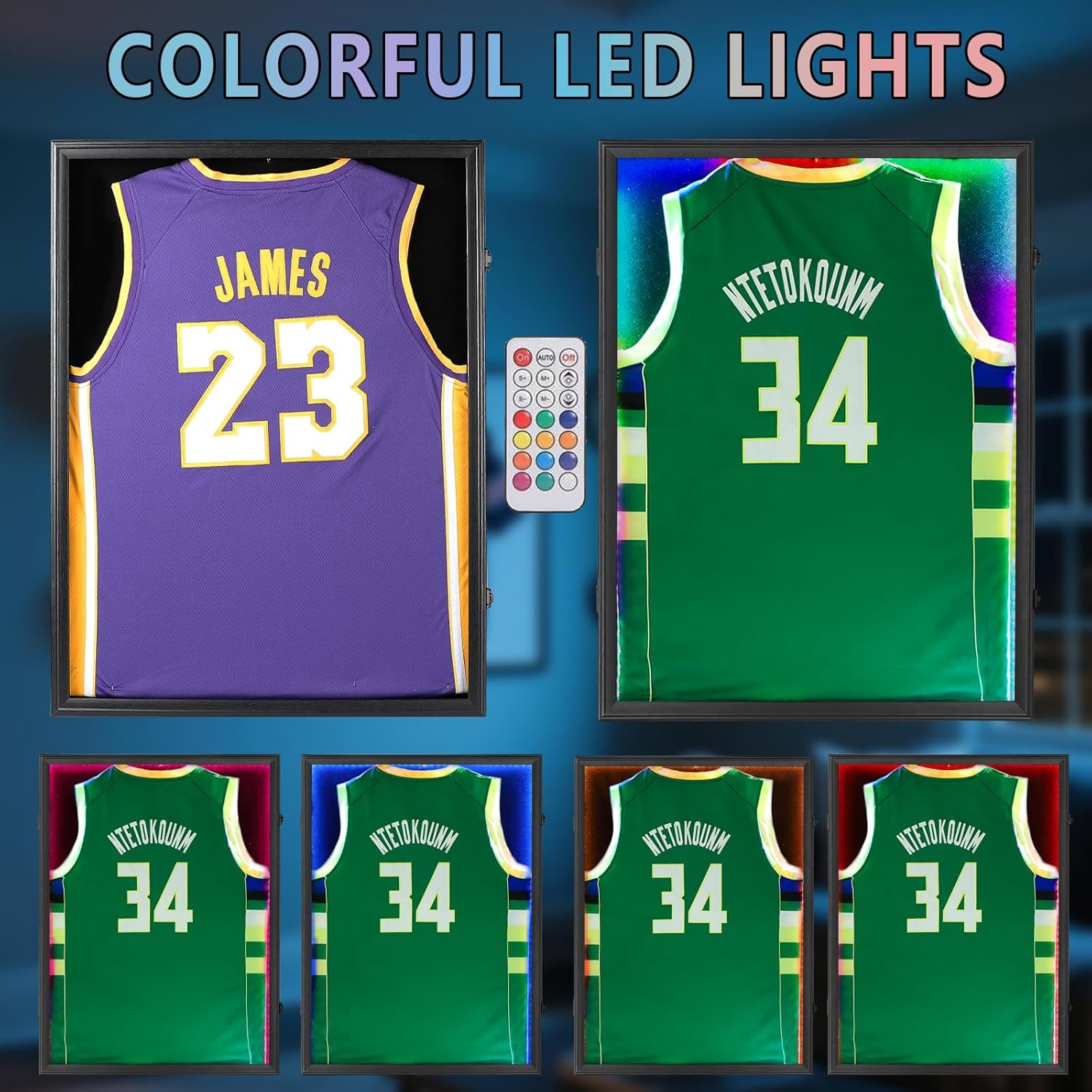 - [JERSEY FRAME WITH LED]- IHEIPYE LED Jersey Frame Display Case is made of high quality wood and comes with attachable LED light strips to add sparkle to your jerseys. You can use the remote control to select the colour of the light and the way it flashes to add a better display to your collection. The jersey frame with LED strips is durable and safe to the touch and won't damage your treasures, while still creating a glamorous and attractive look.