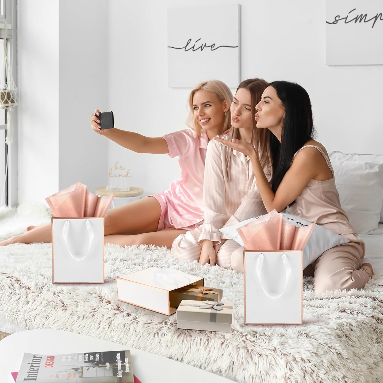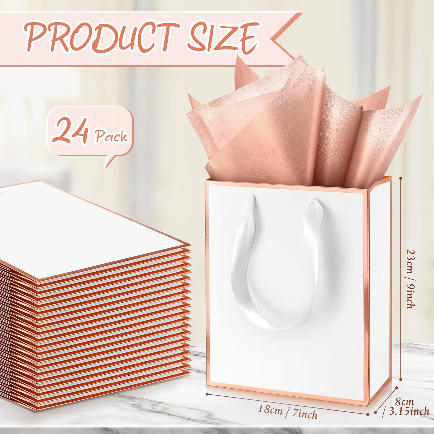 - Exquisite Design: gift bag features the appearance of white and hot stamping rose gold edge design, carrying handle with white satin ribbon, leaving a deep elegance impression; There is no text on the gift bag, you can write your blessing on the bag to express your feelings
